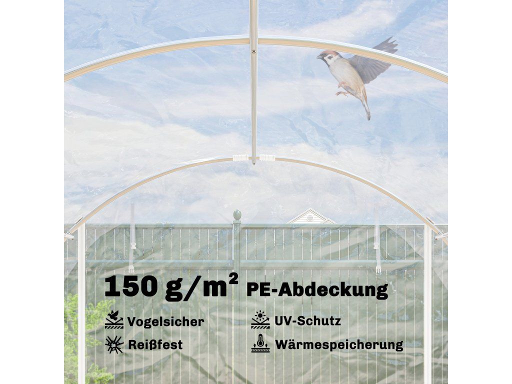 PE kryt: PE materiál o gramáži 150 g/m² je vodotěsný, odolný vůči UV záření a zajištěn 40 sponami. Prodloužený kryt polystyrenového tunelu optimalizuje izolaci a utěsnění tím, že jej zatíží nebo zahrabe.