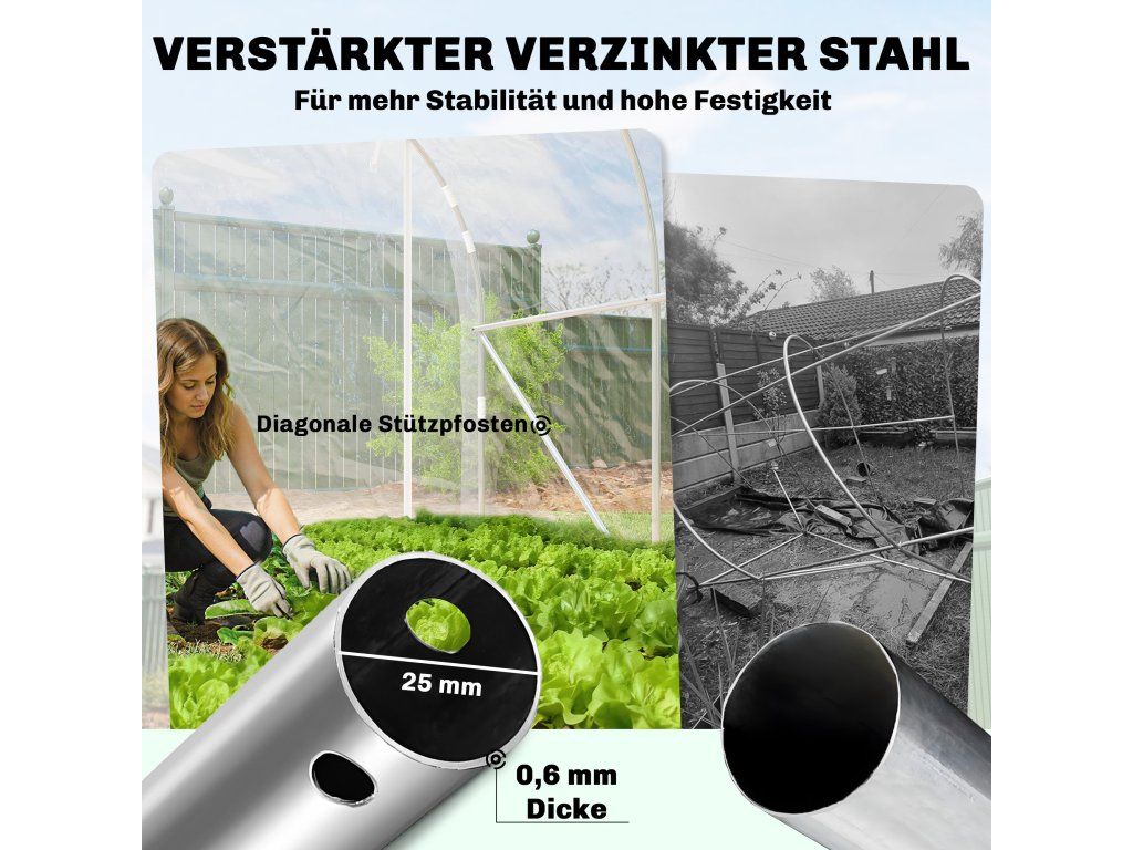 Robustní konstrukce: Pozinkovaný ocelový rám a diagonální podpěrné tyče Skleníky nabízejí ochranu proti korozi a stabilitu. Ideální pro pěstování ovoce a zeleniny – užijte si zahradničení!