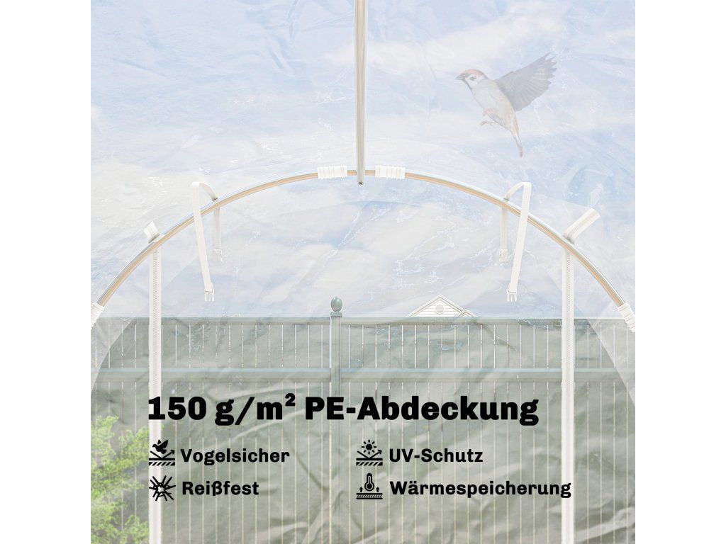 PE kryt: PE materiál o gramáži 150 g/m² je vodotěsný, odolný vůči UV záření a zajištěn 40 sponami. Prodloužený kryt polystyrenového tunelu optimalizuje izolaci a utěsnění tím, že jej zatíží nebo zahrabe.