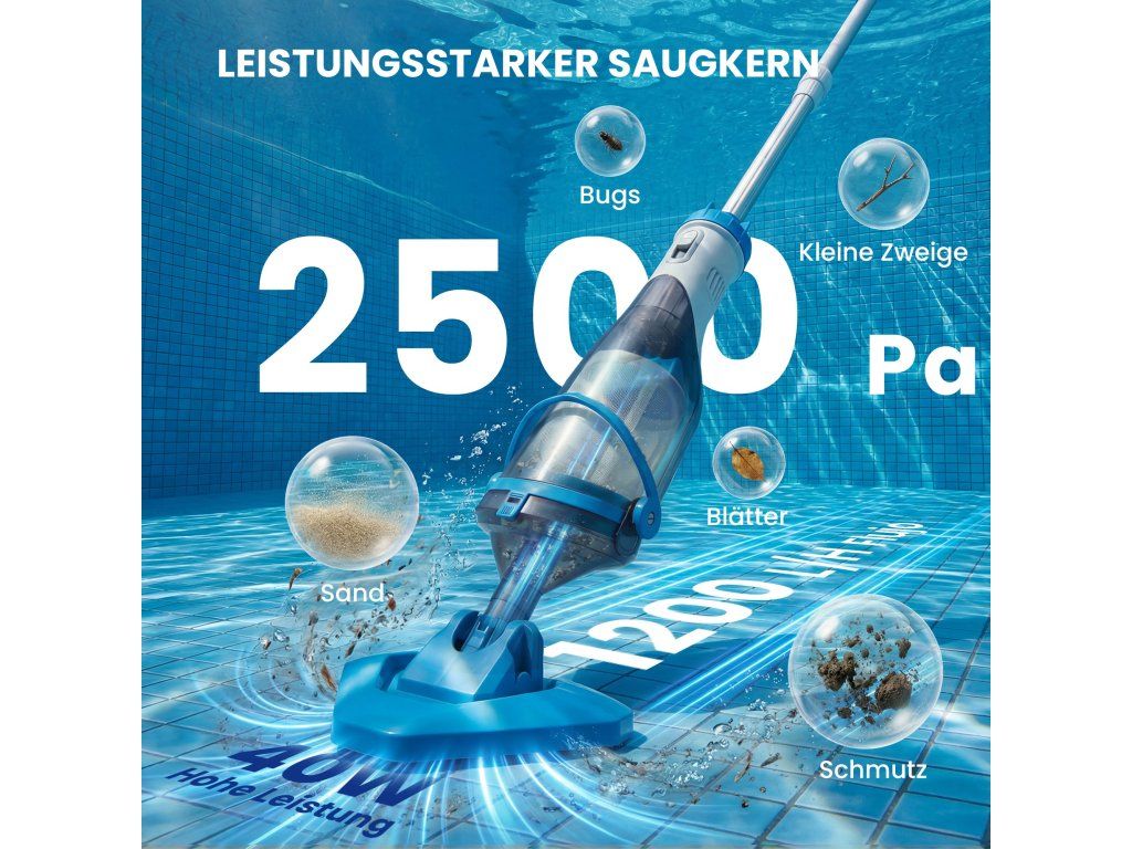 Výkonné sací jádro: 40W motor poskytuje sací výkon 25 000 Pa a průtok 1 200 l/h. Bazénový vysavač bez námahy odstraňuje listí a písek. Méně času na čištění, více času na váš bezchybný bazén.