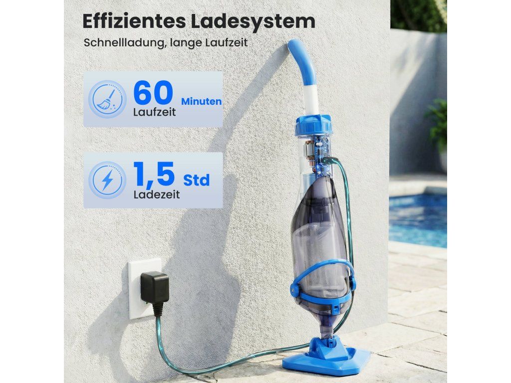 Efektivní systém nabíjení: Plně nabitý za pouhých 90–120 minut pro 50–60 minut nepřetržitého provozu. Jasně viditelné červené a zelené kontrolky na zástrčce vás informují, kdy je bazénový vysavač připraven k použití.