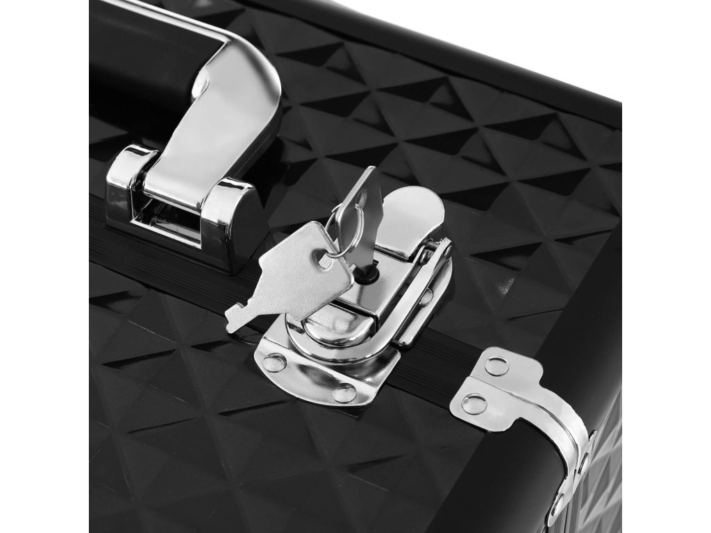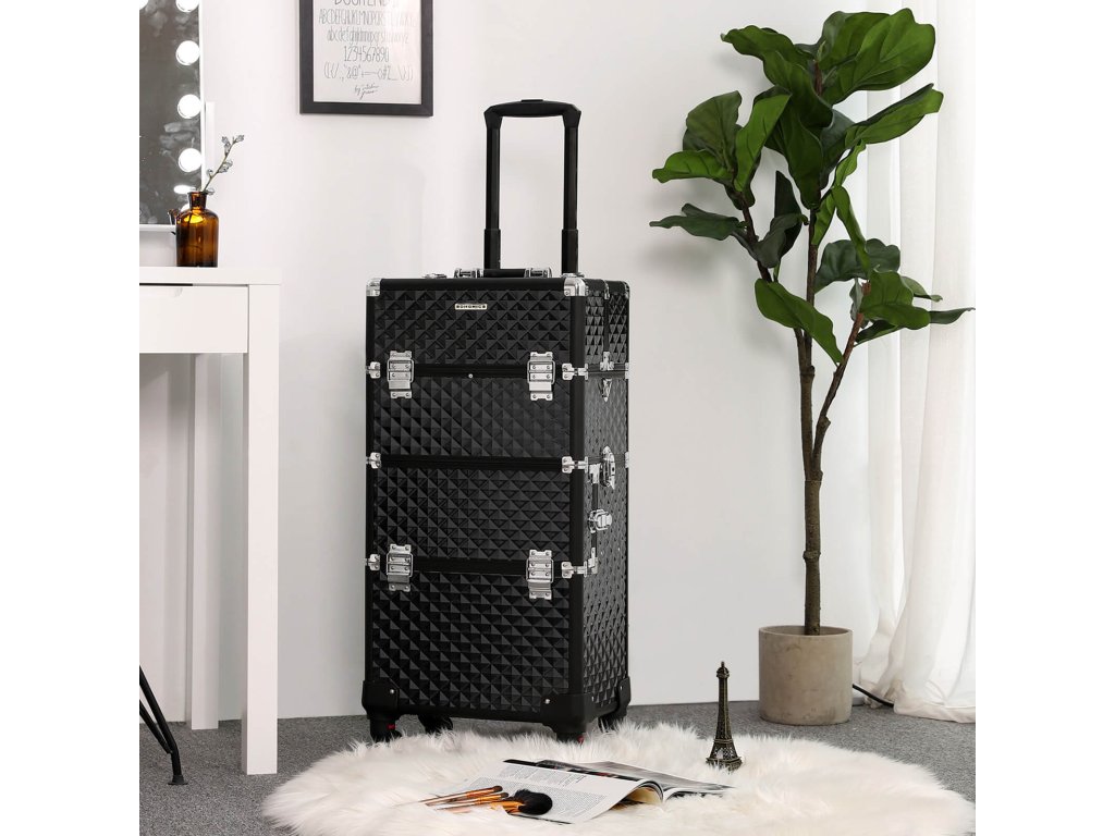 Profesionální kosmetický kufřík, cestovní kosmetický vozík, velký kosmetický vozík pro kadeřníky, uzamykatelný kufřík na kolečkách s univerzálními kolečky, víkem a popruhem přes rameno, černý.
