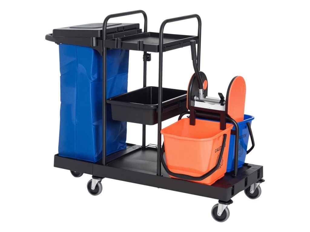 Profesionální úklidový vozík vám značně usnadní práci. Je ideální pro úklid velkých prostor v hotelech, nemocnicích nebo kancelářích. Vozík je vyroben z robustního plastu, má čtyři hladce se pohybující kolečka, dvě police a velkokapacitní odpadkový sáček. Dodává se také se dvěma různě barevnými kbelíky s odnímatelnými ždímačkami – díky tomu bude vaše práce ještě snazší a čistší.