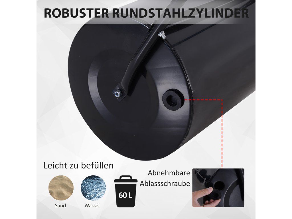 Objem 60 l: Ocelová láhev se dá naplnit až 60 litry vody nebo písku. Odtok umožňuje rychlé vyprázdnění.