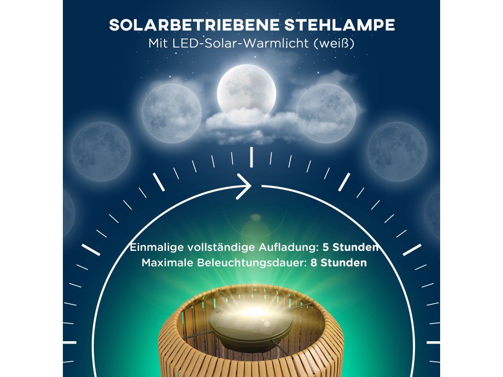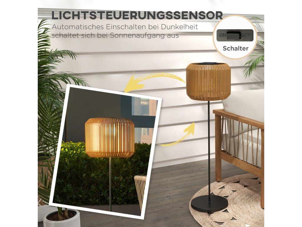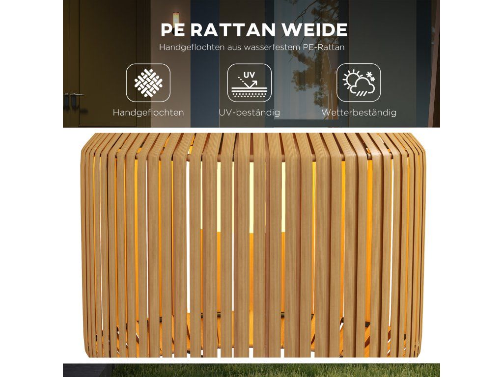 Vhodné pro venkovní použití: Naše zahradní stojací lampa je chráněna práškově lakovaným kovovým rámem obaleným odolným polyratanem, který nabízí vysokou odolnost vůči UV záření a povětrnostním vlivům. Světlo má stupeň odolnosti proti vodě IP44.