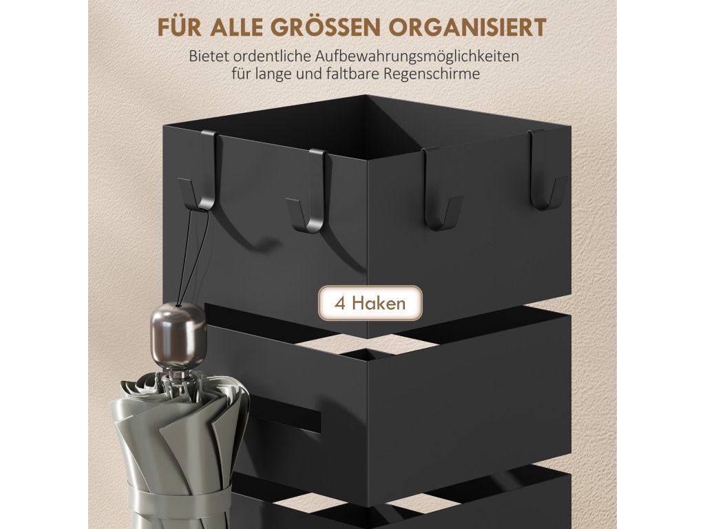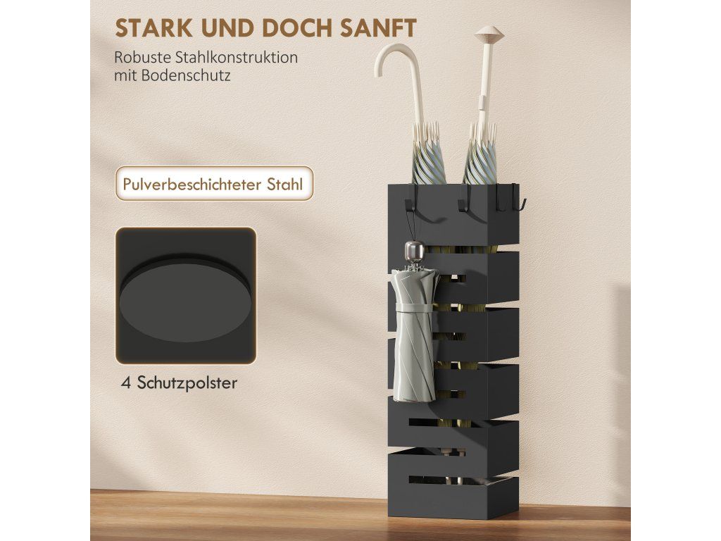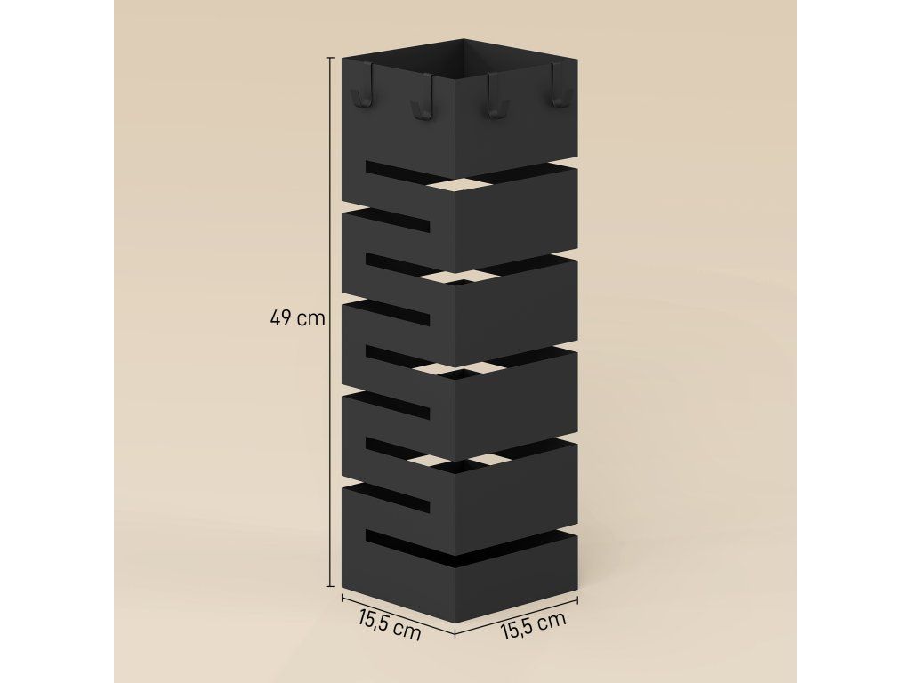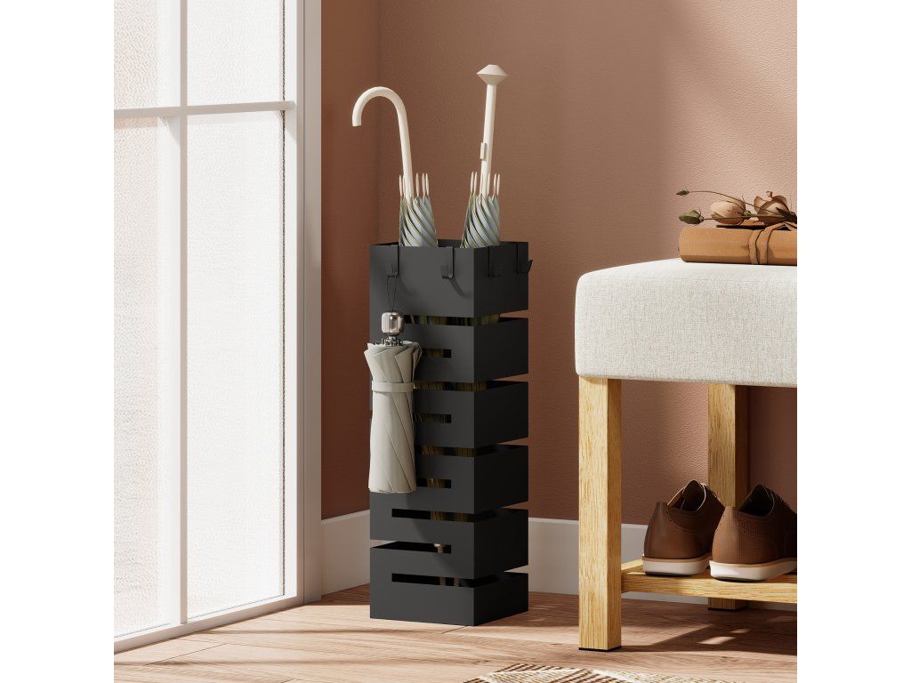 Uspořádejte deštníky jakékoli velikosti: Držák na deštníky o rozměrech 15,5 x 15,5 x 49 cm a se čtyřmi háčky nabízí prostor pro osm deštníků a zajišťuje uklizenou chodbu.