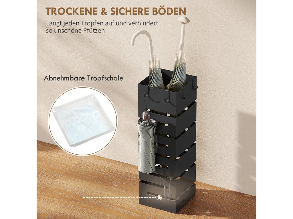 Suché a bezpečné podlahy: Odnímatelná odkapávací miska stojanu na deštníky spolehlivě zachycuje kapající vodu, chrání před poškozením vodou a minimalizuje riziko uklouznutí – pro bezpečnost vaší rodiny.