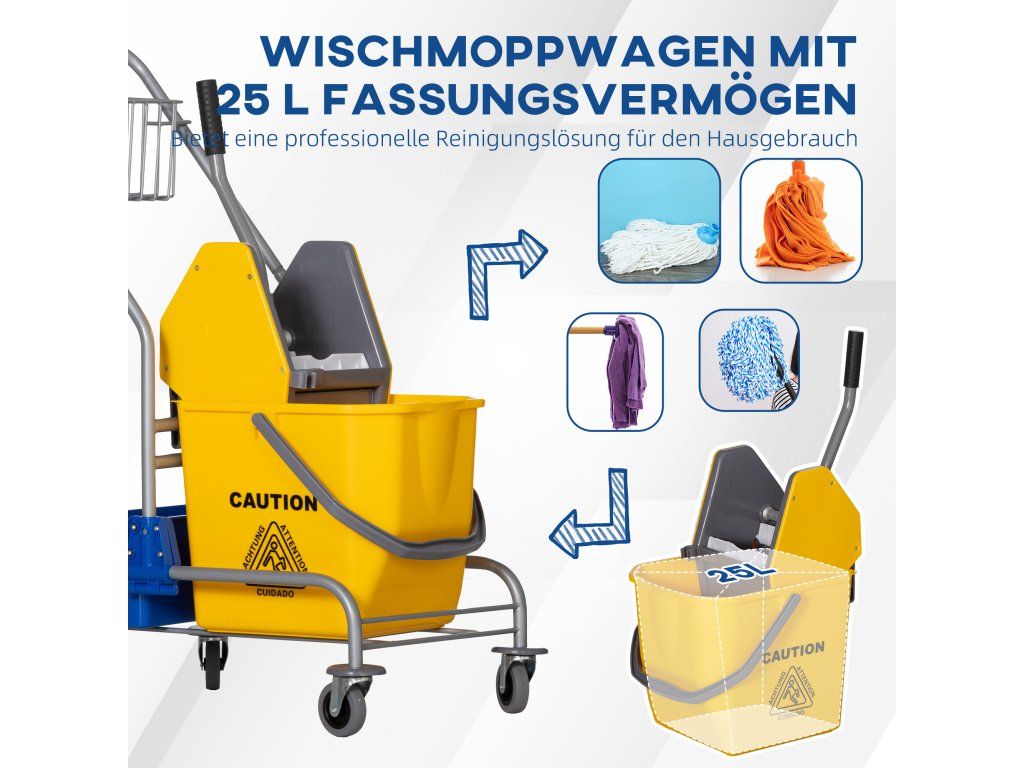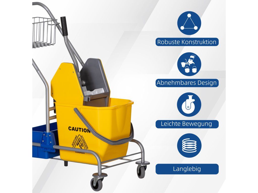 Dodané příslušenství: Všestranný vozík je vybaven velkorysým 25litrovým kbelíkem, závěsným košem na úklidové potřeby a pevně instalovanou plastovou policí.