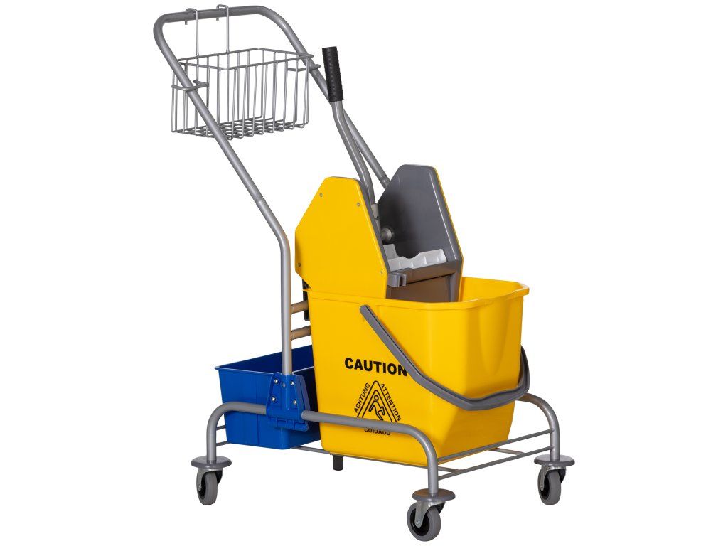 Úklidový vozík s odšťavňovačem je ideální pro profesionální čištění podlah. Je vyroben z vysoce kvalitního plastu, což zaručuje odolnost a robustnost. Je vybaven 25litrovým kbelíkem, plastovou policí a úložným košem, takže se snadno ovládá a přepravuje díky čtyřem kolečkům a ergonomické rukojeti.