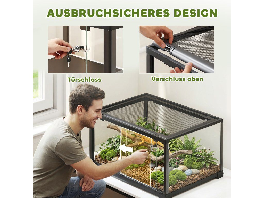 Bezpečnost proti úniku: Spolehlivá horní západka a posuvný zámek dveří zajišťují, že vaše terárium je vždy bezpečně uzavřené, a poskytují vám klid, ať už jste doma, nebo ne.
