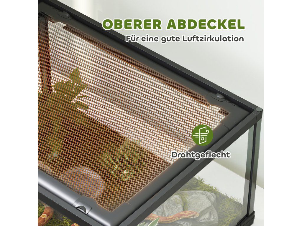 Větrané terárium: Celosíťovaný strop terária umožňuje vynikající cirkulaci vzduchu a efektivní pronikání UVB záření, čímž vytváří optimální a pohodlné prostředí pro plazy.