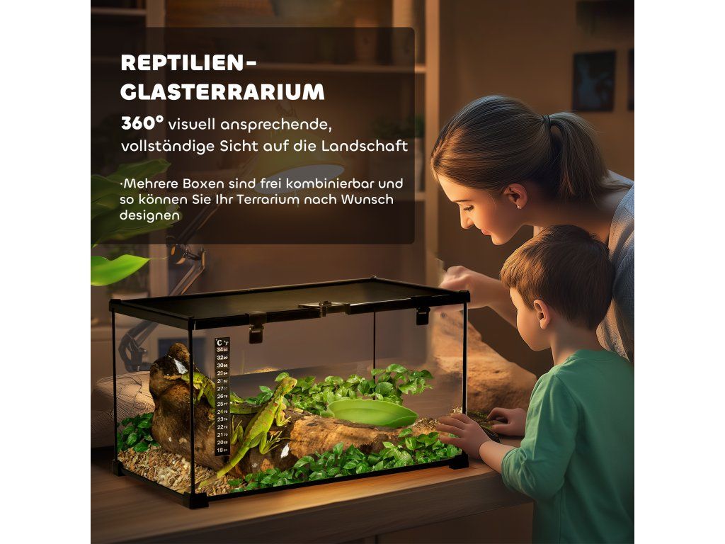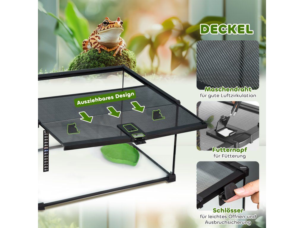 Vodotěsnost: Do tohoto terária pro plazy můžete přidat vodu, protože základna je vodotěsná. Zvýšený rám základny pro montáž topného tělesa substrátu. Dodává se s páskovým teploměrem (teplotní rozsah 18-34 °C) pro snadné měření teploty.