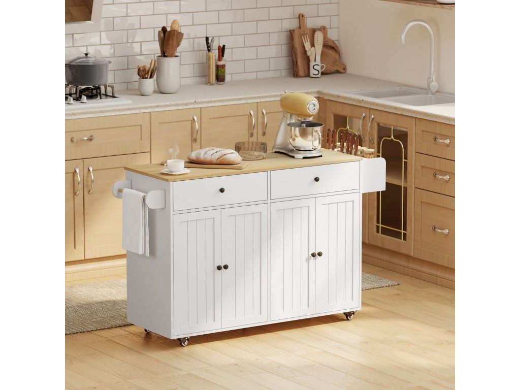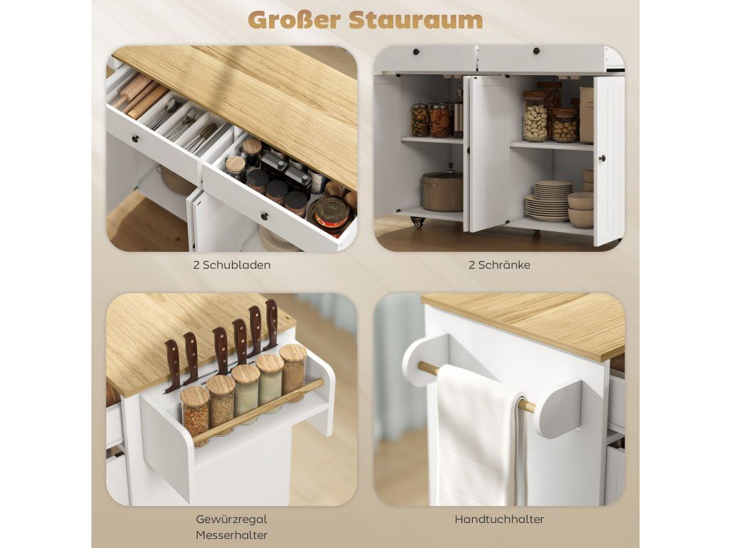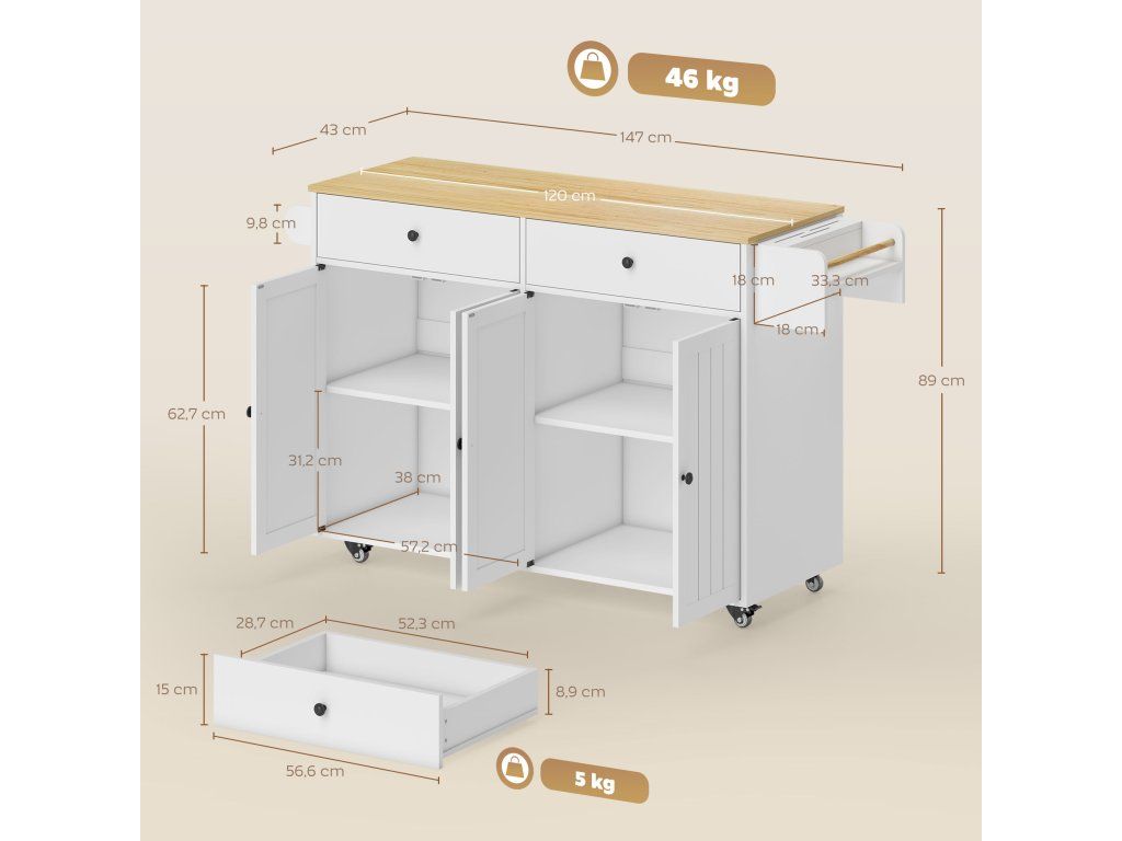 Už vás nebaví stísněná kuchyně plná nepořádku, kde hledání ingrediencí a náčiní narušuje vaši pohodu při vaření? Kuchyňský ostrůvek přináší do vašeho prostoru pořádek a komfort. Díky pohyblivému designu jej můžete snadno přemístit kamkoli potřebujete a bezpečně upevnit. Prostorné zásuvky a skříňky spolu s praktickými držáky na ručníky, koření a nože udržují všechny kuchyňské potřeby uspořádané a vždy po ruce. Tento ostrůvek promění vaši kuchyni v funkční a přehledné místo, kde vaření bude zábava, nikoli stres.
