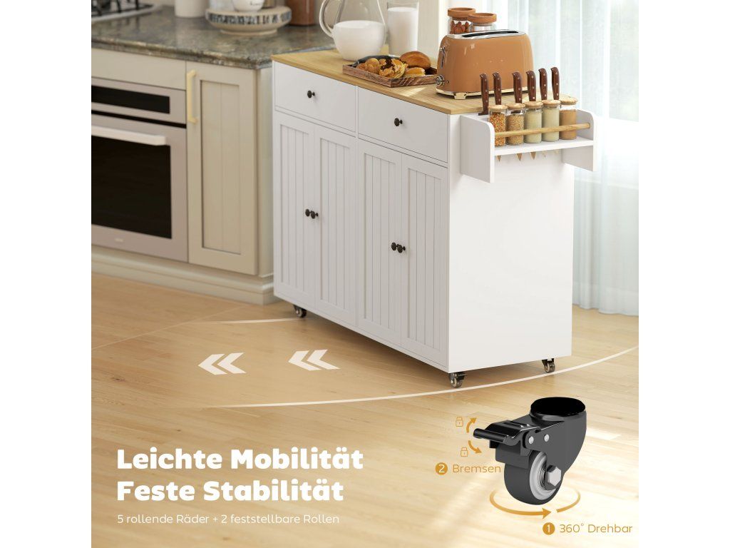 Snadná mobilita a uzamčení: Přesuňte kuchyňský ostrůvek na ideální místo na pěti univerzálních kovových kolečkách a dvě z koleček zajistěte, abyste zajistili stabilní a bezpečnou pracovní plochu během hektického vaření snídaně nebo večeře.
