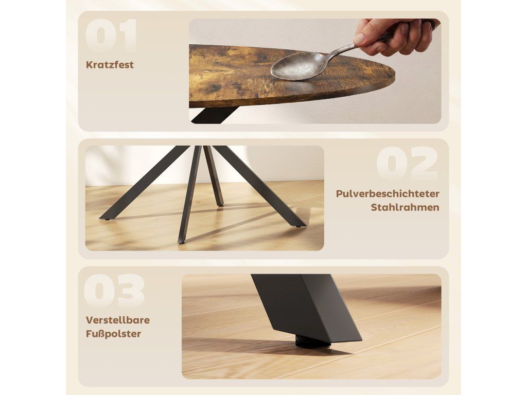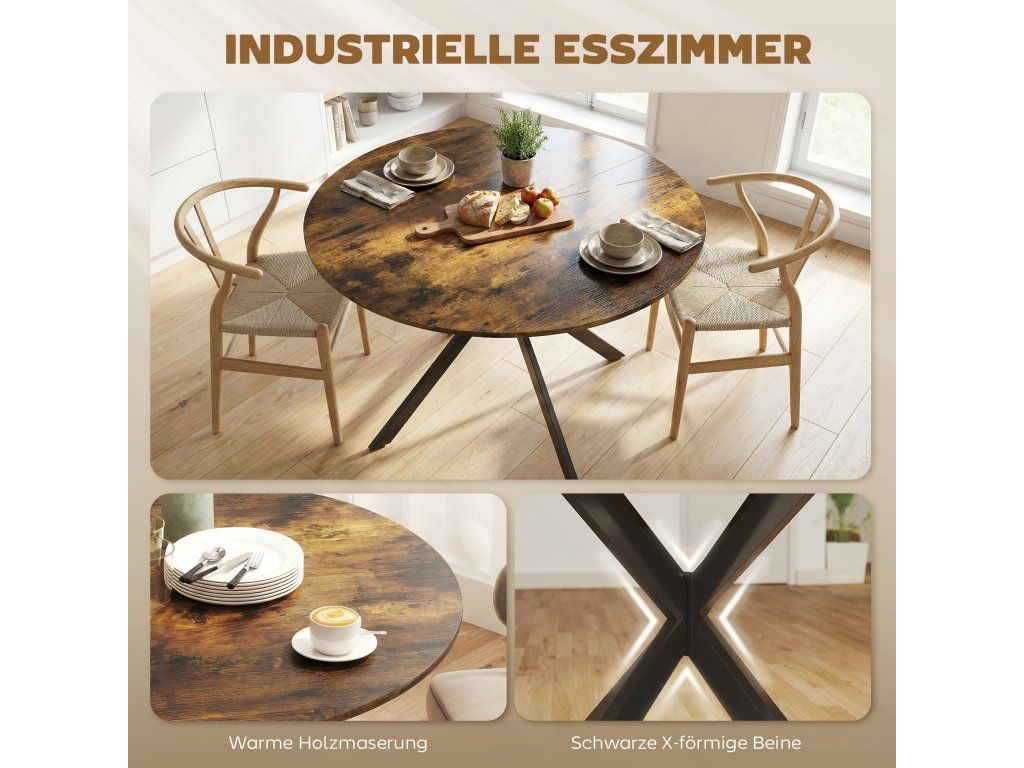 Tento kulatý jídelní stůl má povrch s efektem dřeva a jeho výrazné nohy ve tvaru X nabízejí dokonalou kombinaci pohodlí a stylu. Tento kuchyňský stůl, který se hodí pro čtyři osoby, je ideální pro pohodové brunche, živé herní večery nebo večeře při svíčkách. Nastavitelné nohy zajišťují stabilitu i na nerovné podlaze.