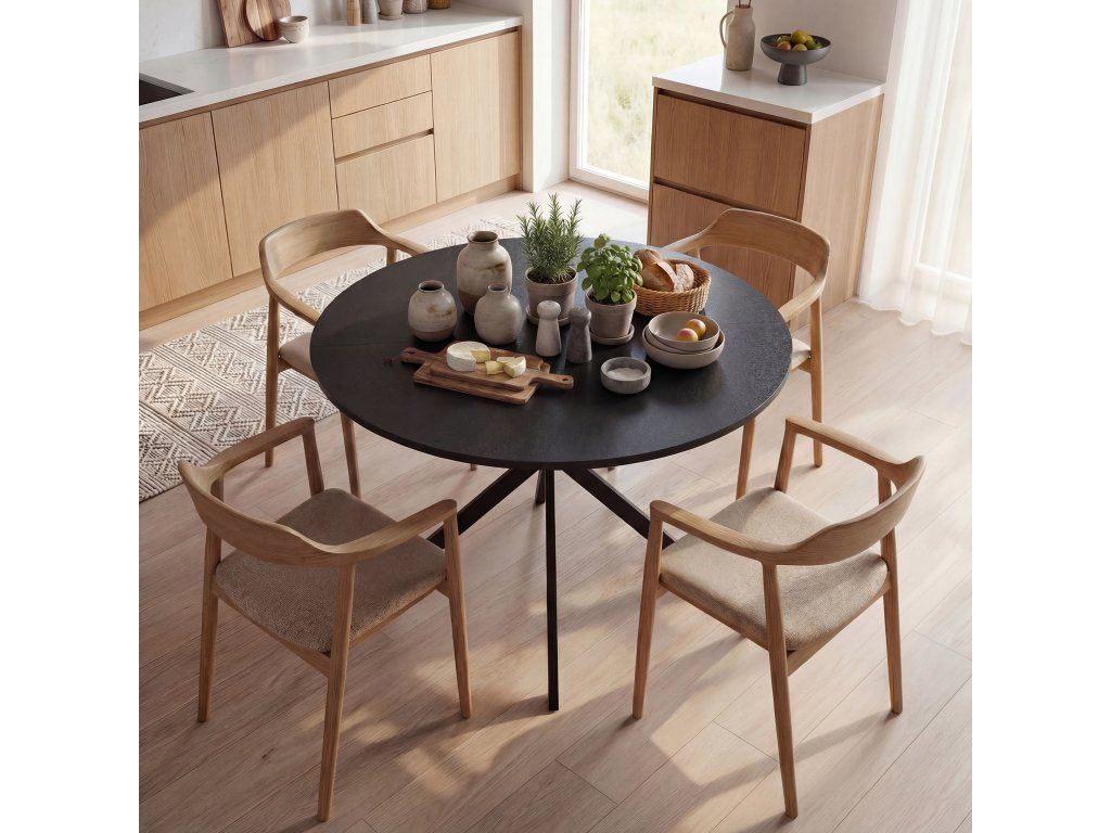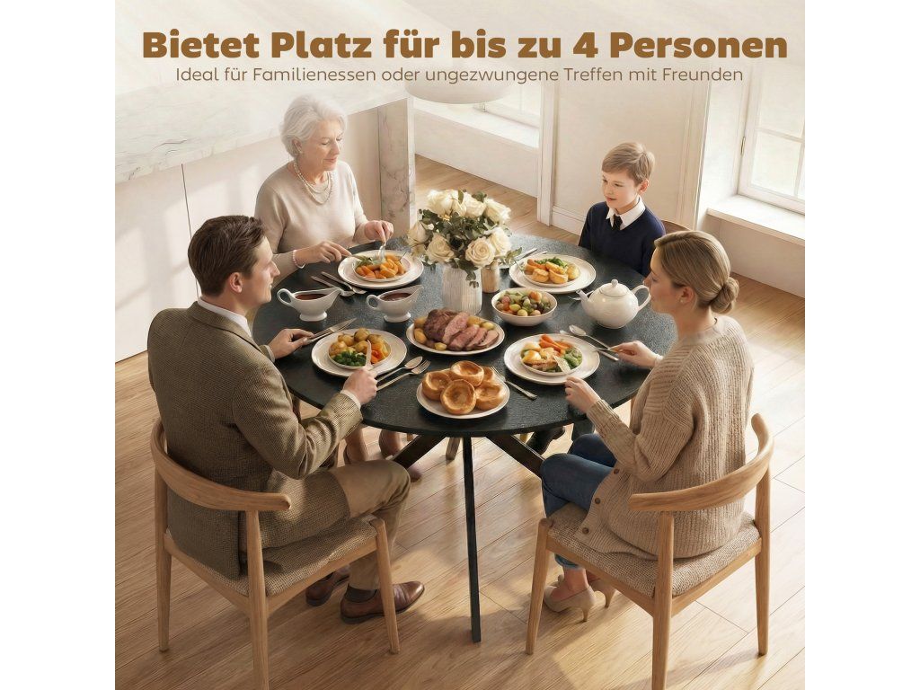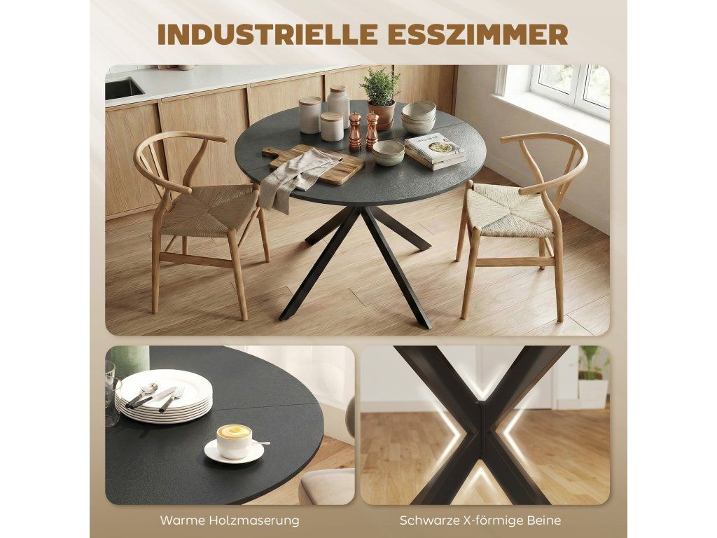 Tento kulatý jídelní stůl má povrch s efektem dřeva a jeho výrazné nohy ve tvaru X nabízejí dokonalou kombinaci pohodlí a stylu. Tento kuchyňský stůl, který se hodí pro čtyři osoby, je ideální pro pohodové brunche, živé herní večery nebo večeře při svíčkách. Nastavitelné nohy zajišťují stabilitu i na nerovné podlaze.