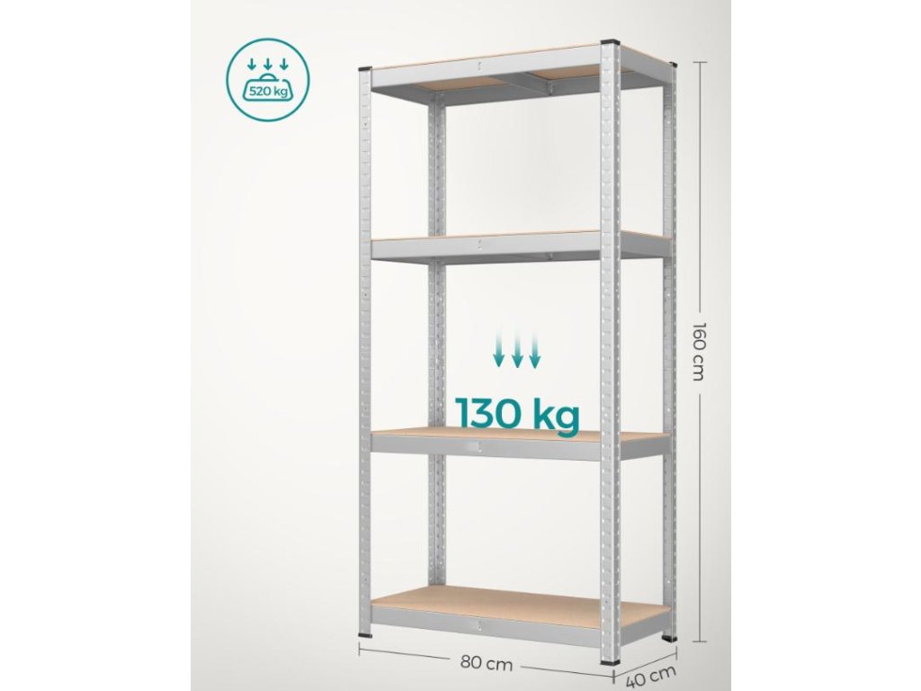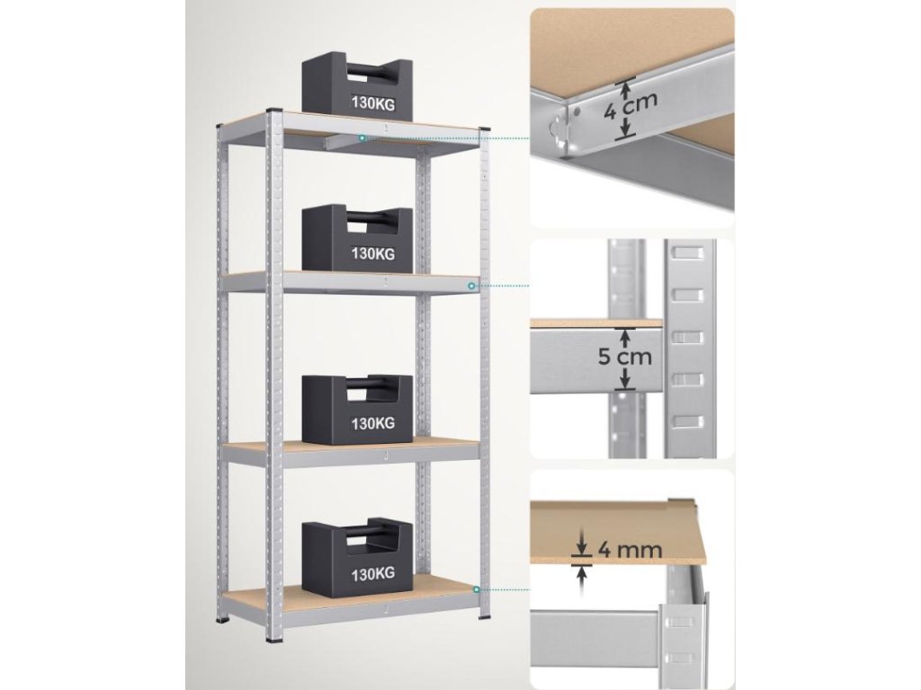 Tato odolná sada dvou ocelových úložných regálů představuje robustní a flexibilní úložné řešení pro vaši garáž, dílnu, sklep nebo skladovací jednotku. Každá police unese až 130 kg, což vám umožní uložit i ty nejtěžší předměty, jako jsou nástroje, nářadí nebo vybavení. Regály lze používat společně nebo je lze rozdělit na dvě spodní jednotky, které fungují jako samostatné police nebo pracovní desky. Montáž je rychlá a snadná, bez nutnosti použití šroubů. Nastavení výšky polic v krocích po 3 cm vám umožní snadno přizpůsobit prostor vašim potřebám. Zesílené příčníky zvyšují stabilitu a nosnost každé police, zatímco přídavné ochranné kryty nohou zabraňují poškrábání a minimalizují hluk. Práškově lakovaná ocelová konstrukce je odolná a korozivzdorná, což zaručuje dlouhou životnost výrobku i při náročném používání.