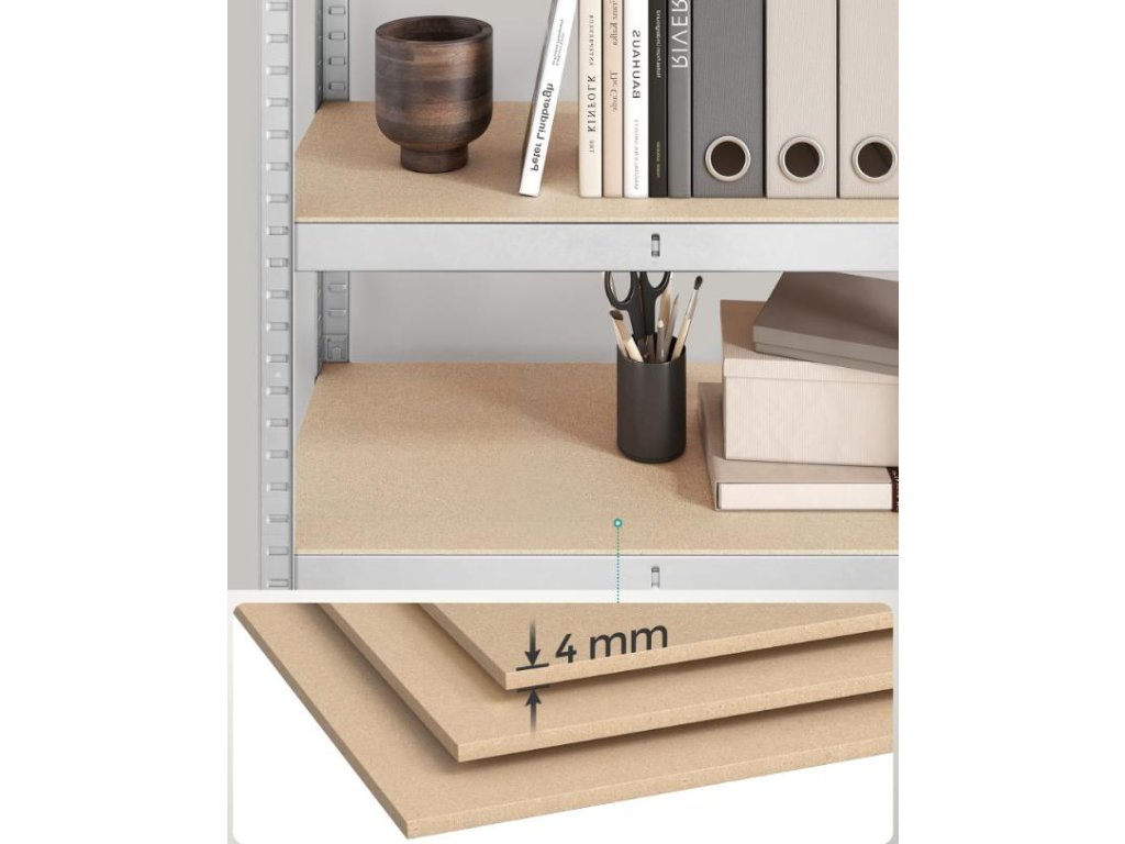 Sada 2 ocelových polic a MDF desek s možností dělení, výškovým nastavením po 3 cm, výztuhami a ochrannými kryty nohou.