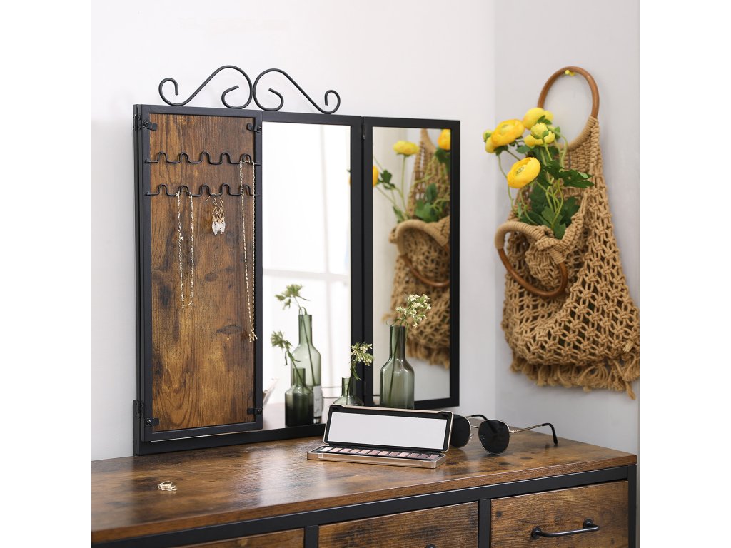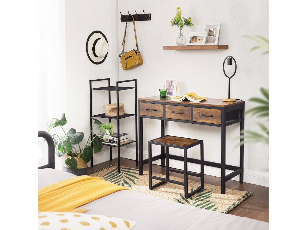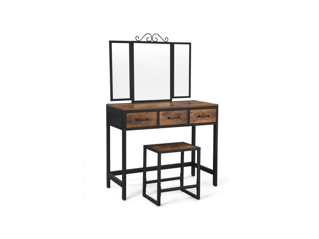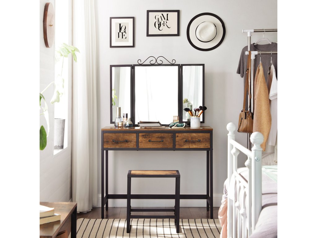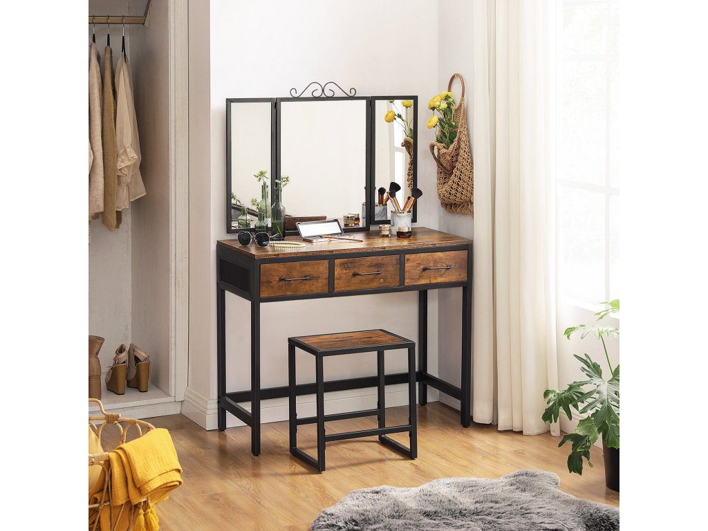 Sada toaletního stolku a stoličky s trojskladovým zrcadlem, 3 zásuvky, kosmetický stolek s ocelovým rámem, industriální styl, rustikální hnědá a černá.