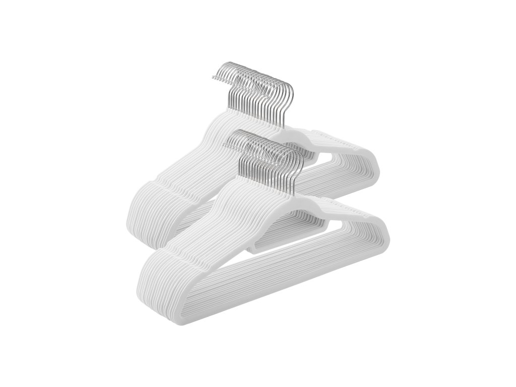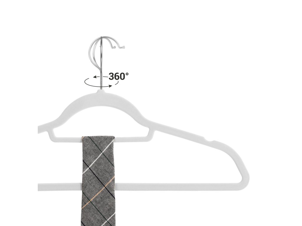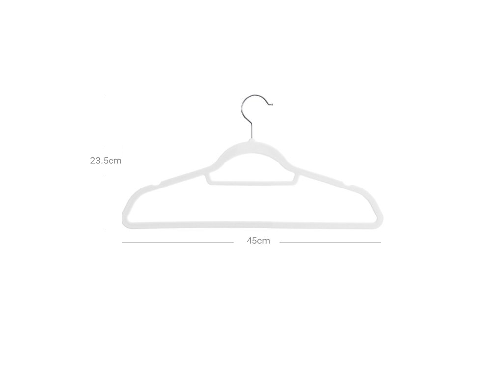 Sametová ramínka, 50 ks v balení, protiskluzová ramínka na oblečení, tloušťka 0,6 cm, šetří místo, háčky otočné o 360°, délka 43,5 cm, na kabáty, bundy, košile, šaty, kalhoty, v bílé barvě.