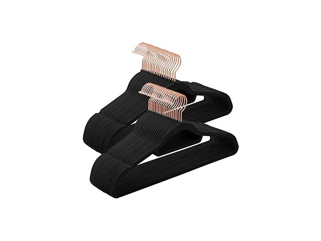 Sametová ramínka, 50 kusů, protiskluzová ramínka na oděvy s otočným háčkem v barvě růžového zlata, tloušťka 0,6 cm, úspora místa, délka 45 cm, na kabáty, košile, šaty, kalhoty, kravaty, černá.