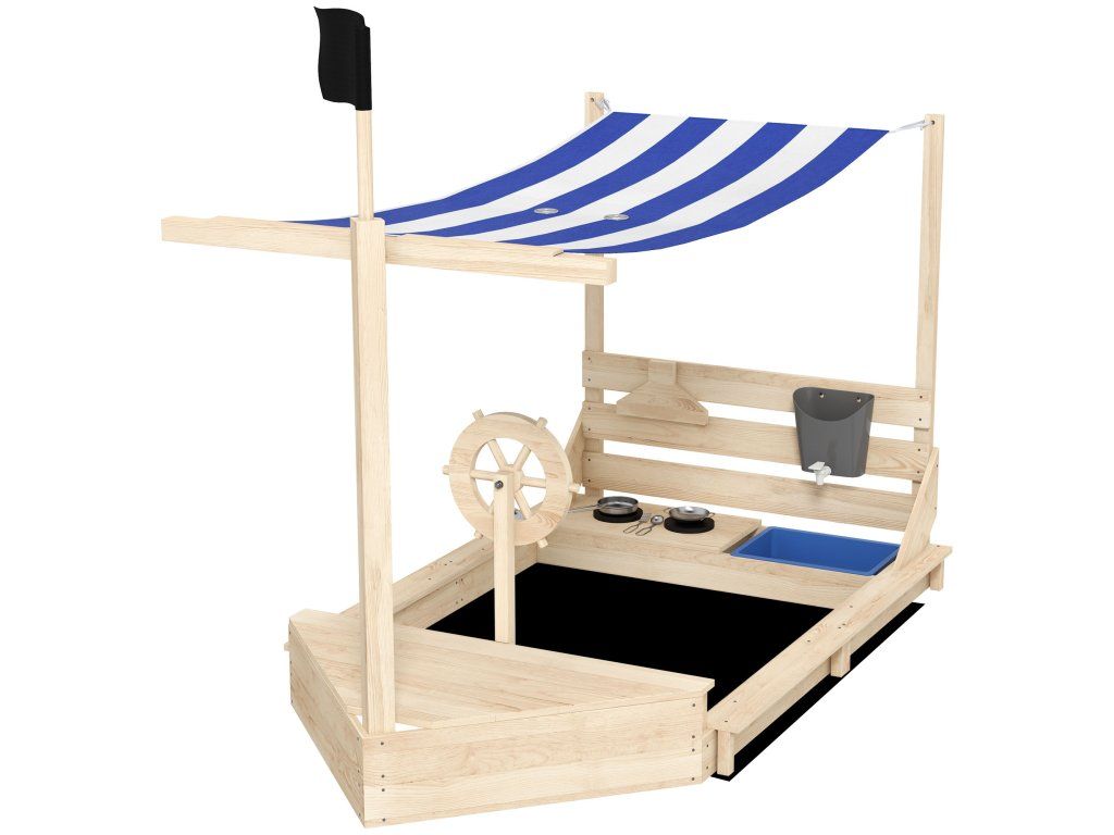 Vztyčte pirátskou vlajku, naloďte se na tuto šalupu! Takhle by brzy mohlo vypadat odpoledne strávené hraním na vaší zahradě, protože toto pískoviště je skutečná pirátská loď s veslem a úkrytem na poklad (nebo hračky do písku). Součástí je také velkoryse dimenzovaná kuchyňská herní sada, protože co by to bylo za pirátskou loď bez kuchyně?! Jak se sluší, „loď“ je vyrobena z přírodního dřeva, které je odolné vůči povětrnostním vlivům a bezpečné pro děti. A konečně, praktická stříška poskytuje ochranu před sluncem a deštěm.