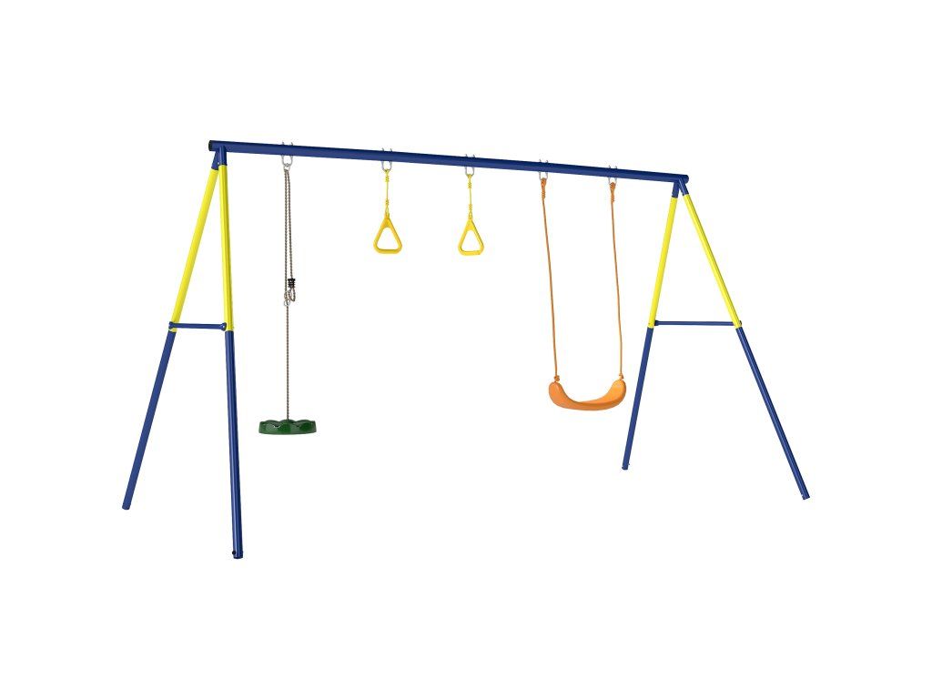 Odolná a bezpečná: Tato dětská houpací sada je vyrobena z práškově lakovaného kovu a nabízí stabilní a povětrnostním vlivům odolnou konstrukci. Konstrukce rámu ve tvaru A se čtyřmi zemními kotvami minimalizuje kývání a převrácení během energické hry a bezpečně unese až 150 kg.