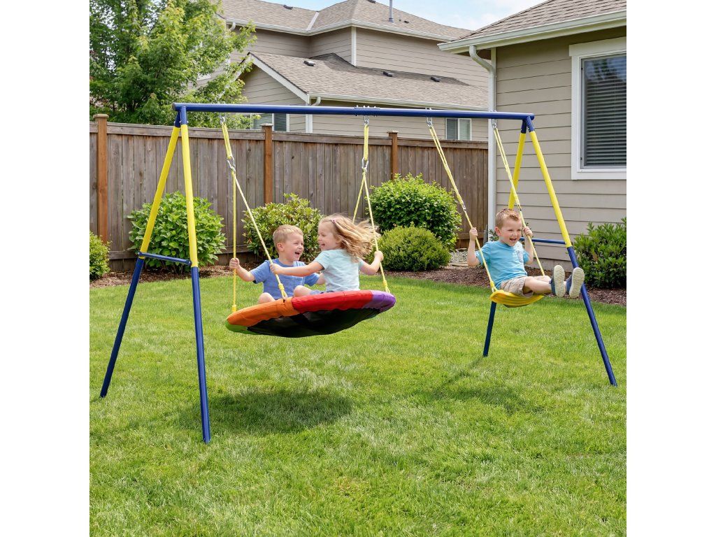 Přineste si na zahradu nekonečnou zábavu a venkovní potěšení s touto dětskou houpačkou. Robustní ocelový rám ve tvaru A s trojúhelníkovou podpěrou a zemními kotvami poskytuje bezpečnou a stabilní základnu. Díky nastavitelným lanům na houpačce pro batolata se sada v průběhu let přizpůsobí a nabízí spolehlivý ústřední bod pro vzácné rodinné chvíle a radostné hraní venku, jak vaše děti rostou.