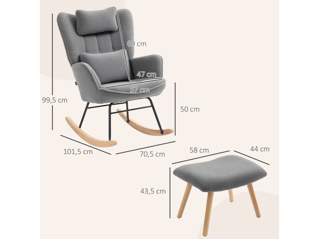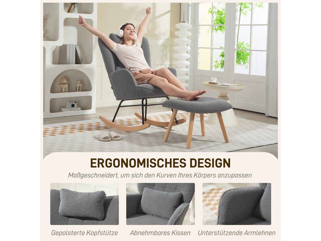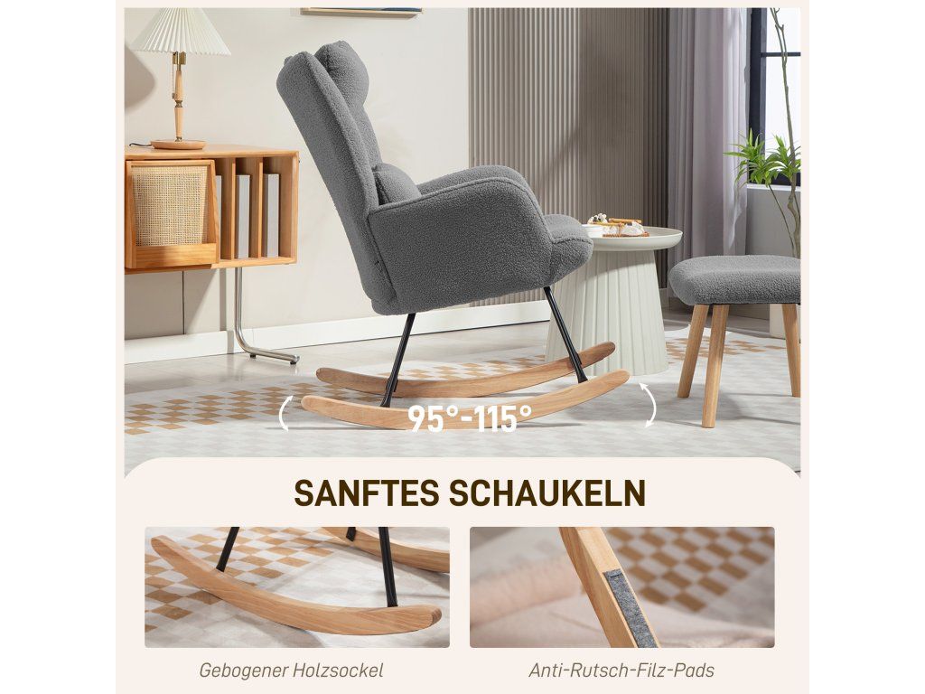 Užijte si houpací křeslo, dokonalou kombinaci stylu a pohodlí. Umožňuje jemný houpací pohyb mezi 95–115° a je polstrované plstěnými podložkami, které chrání vaši podlahu. Toto houpací křeslo je ergonomicky tvarované s měkkou opěrkou hlavy a nohou čalouněnou prodyšným fleecovým materiálem, podepřené robustním ocelovým rámem a elegantními nohami z bukového dřeva a je ideální pro relaxační chvíle.