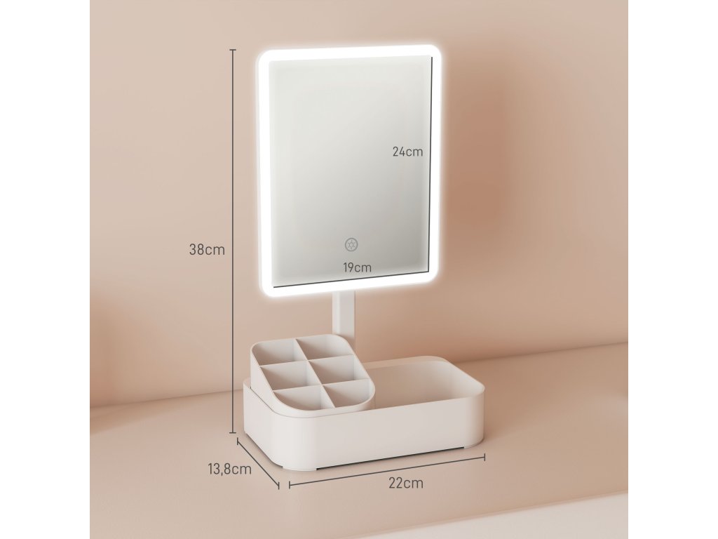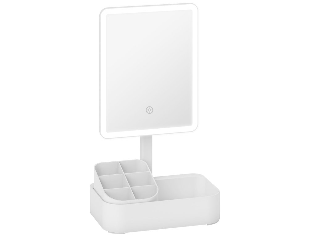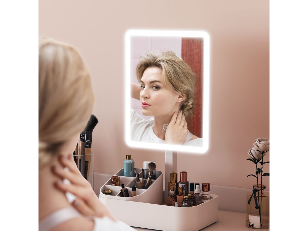 ✔ Kosmetické zrcátko kombinuje osvětlení s přihrádkou na kosmetiku.
