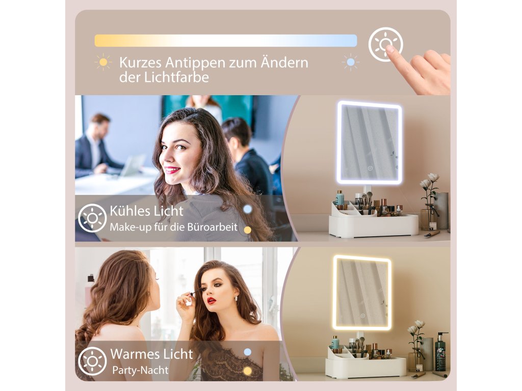 ✔ Dotykové ovládání osvětleného kosmetického zrcátka upravuje světlo od teplého (3500K) po studené (7000K).
