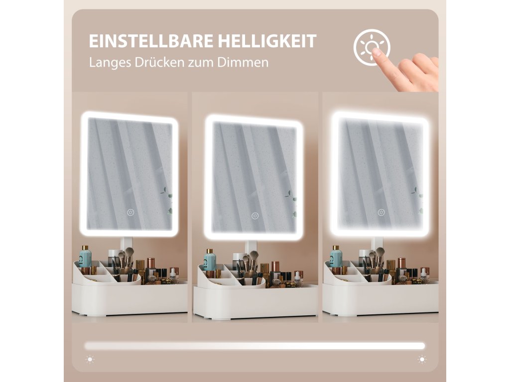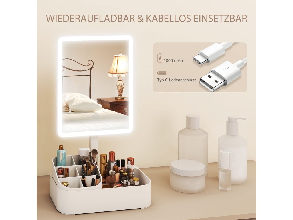 Rozzařte si svou kosmetickou rutinu s podsvíceným kosmetickým zrcátkem! Přepínejte mezi teplým (3500K) a studeným (7000K) světlem dotykem prstu a upravte jas stisknutím a podržením. Díky otočení kosmetického zrcátka o 180 stupňů vždy najdete ten správný úhel. Integrovaný úložný box udrží všechny vaše kosmetické nezbytnosti uspořádané. Dokonalá kombinace funkčnosti a stylu pro váš toaletní stolek.