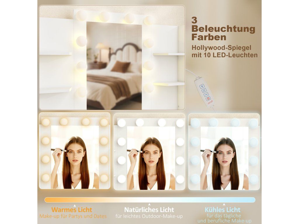 Jemné osvětlení pro každodenní půvab: Zrcadlo na toaletním stolku s 10 LED žárovkami nabízí teplé, přirozené nebo studené světlo pro dokonalý styling – pro uvolnění ráno nebo útulný večer.