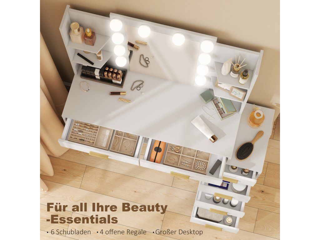Místo pro všechny vaše kosmetické poklady: Šest zásuvek a čtyři otevřené police na toaletním stolku udržují věci uspořádané a snadno dostupné, takže vaše oblíbené parfémy, štětce a drobné nezbytnosti mají vždy uklizené a klidné místo.