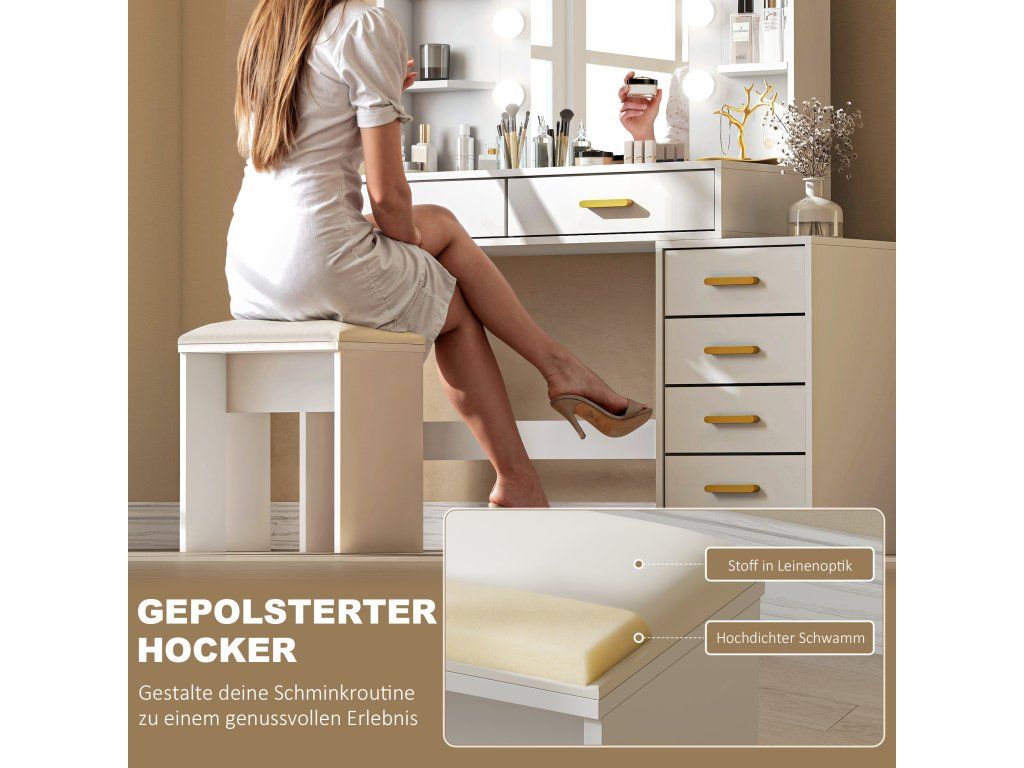 Pohodlné chvíle, úspora místa: Stolička s imitací lnu a pěnovým polstrováním nabízí pohodlí – ideální pro nanášení make-upu. Po použití ji jednoduše zasuňte pod toaletní stolek, abyste si udrželi pořádek.