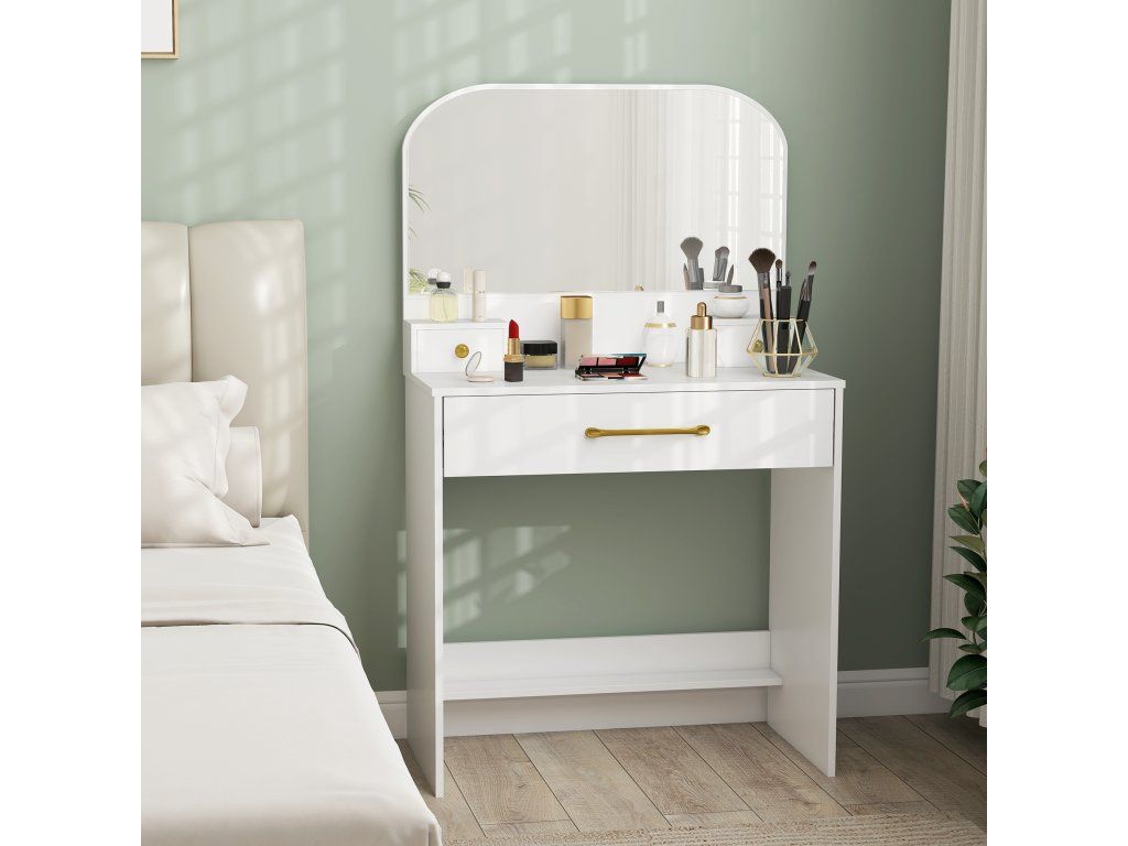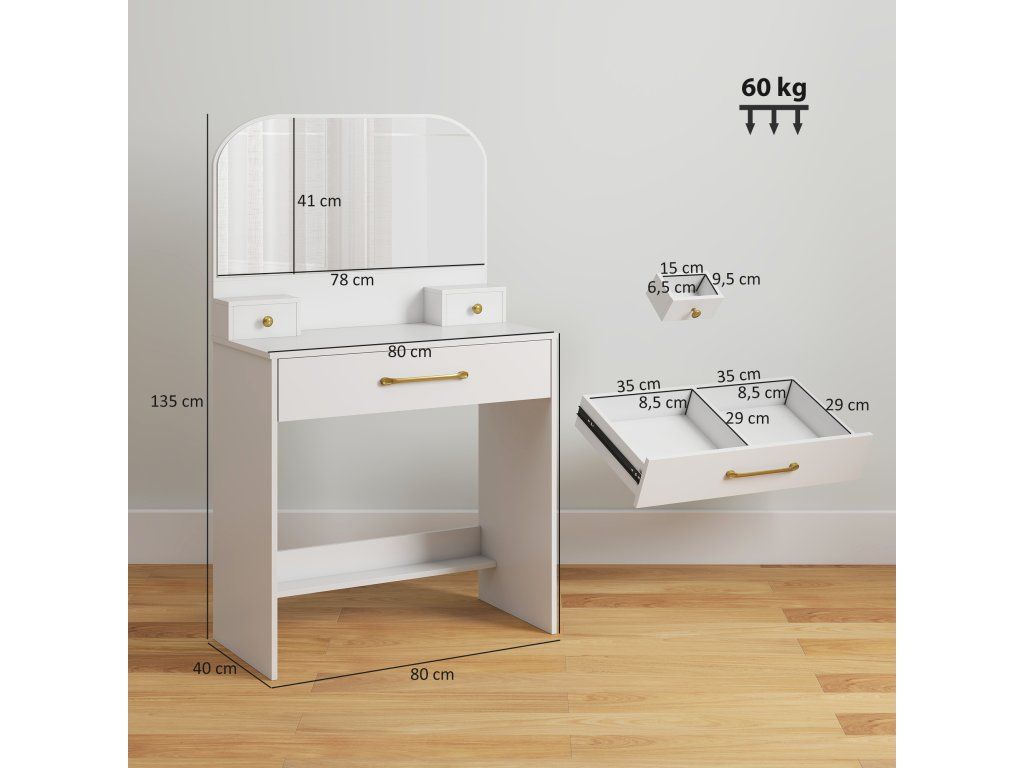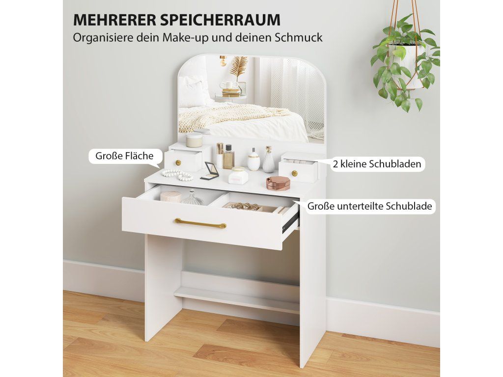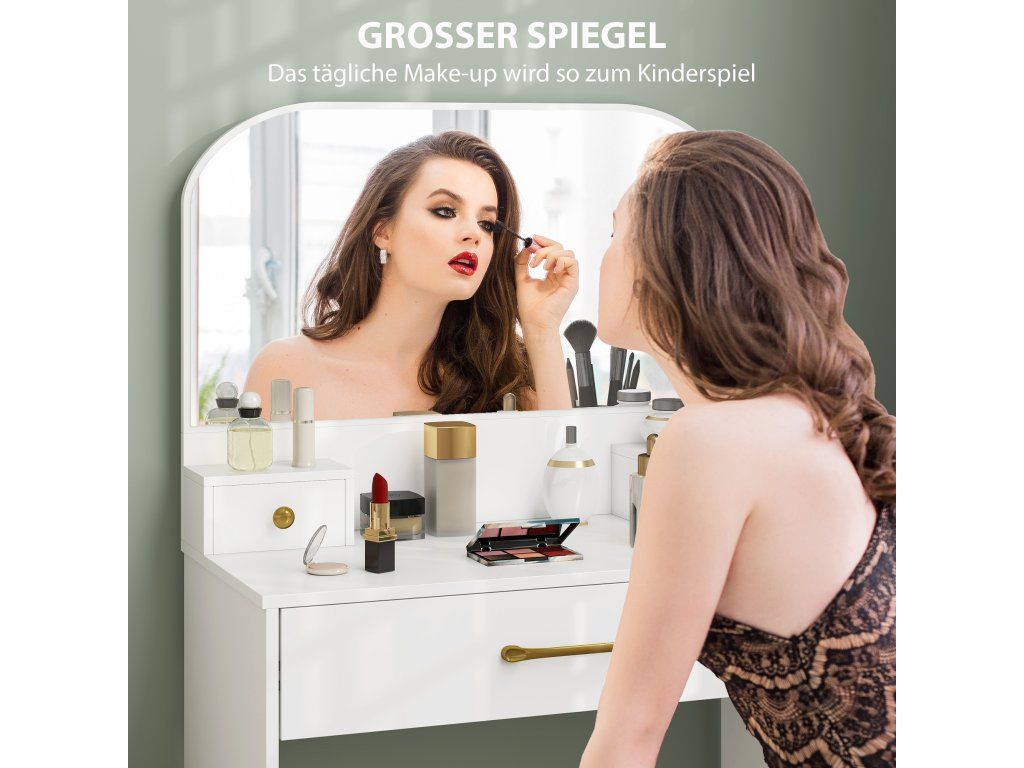 Kompaktní a pohodlný: S rozměry 80 x 40 cm je tento toaletní stolek ideální do ložnic, bytů nebo malých pronajímaných prostor. Prostor pro nohy 76 x 38 cm umožňuje pohodlné sezení při každodenním líčení a péči o pleť.