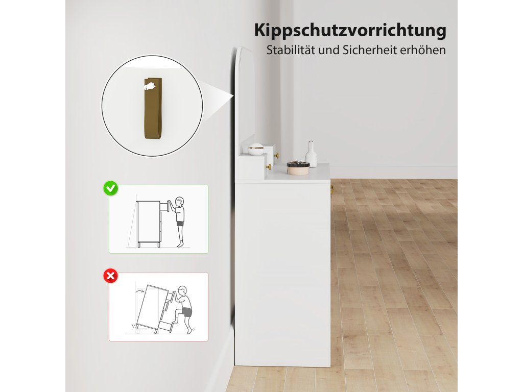 ✔ Obsahuje sadu proti převrácení pro bezpečné ukotvení tohoto toaletního stolku a zajištění bezpečnosti rodiny.