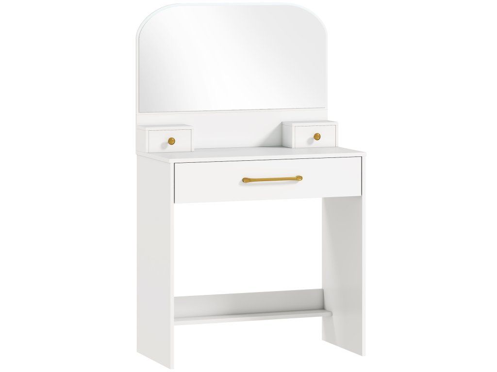 Optimalizujte svou kosmetickou rutinu s toaletním stolkem! Kompaktní a elegantní, perfektně se hodí do malých prostor a nabízí pohodlné sezení pro vaši každodenní péči o pleť. Stylové zakřivené zrcadlo poskytuje jasný výhled a dodává moderní nádech. Díky třem zásuvkám a praktické desce stolku zůstanou vaše kosmetické nezbytnosti uspořádané – perfektní doplněk k uvolněnému rannímu rituálu!