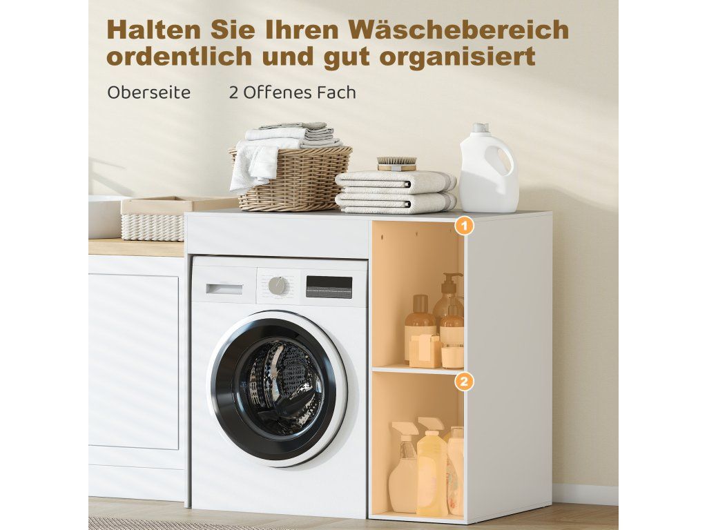 ✔ Horní police a dvě otevřené přihrádky skříňky na pračku udržují prací prostředky a ručníky snadno po ruce.
