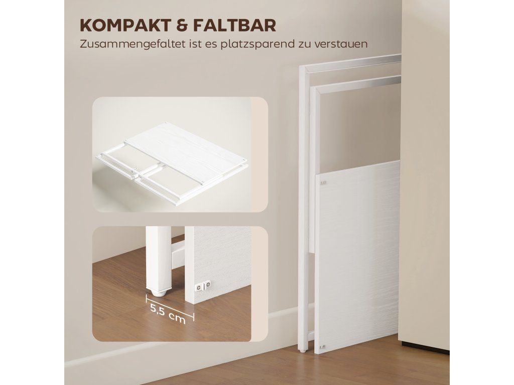 Prostorově úsporný design: Tento kompaktní stůl se složí na pouhých 5,5 cm a je ideální pro byty, studentské pokoje a malé kanceláře. Jednoduše jej uložte pod postel, za pohovku nebo do dveří, abyste okamžitě uvolnili místo a udrželi si domov uklizený.
