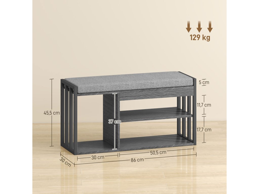 Botník se sedákem nabízí elegantní řešení díky měkkému 5cm polstrování a třípatrovému designu, který úhledně uloží vše od běžné obuvi až po vysoké kozačky. Díky robustnímu rámu s nosností až 129 kg vám tento chodební lavice bude oporou každý den, ať už vyrážíte ven nebo se vracíte domů.