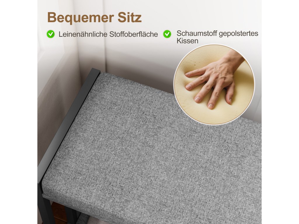 Pohodlné přezouvání bot: Zažijte pohodlí přezouvání na této lavici do předsíně, kde 5 cm silný polštář potažený prodyšnou látkou podobnou lnu poskytuje trvalé pohodlí a oporu.