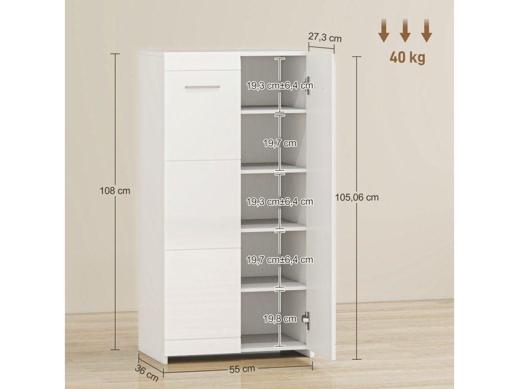 Udržujte svou sbírku bot uspořádanou a stylovou s botníkem! Uschovejte až 10 párů bot (až do velikosti EU 45) a chraňte je před prachem za elegantními dvířky. Upravte tři police tak, aby se do nich perfektně vešly baleríny, tenisky nebo kozačky. Minimalistický design a hladký povrch dodávají moderní nádech chodbám, ložnicím nebo obývacím pokojům, díky čemuž je úložný prostor pro boty praktický i stylový.