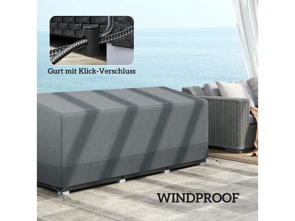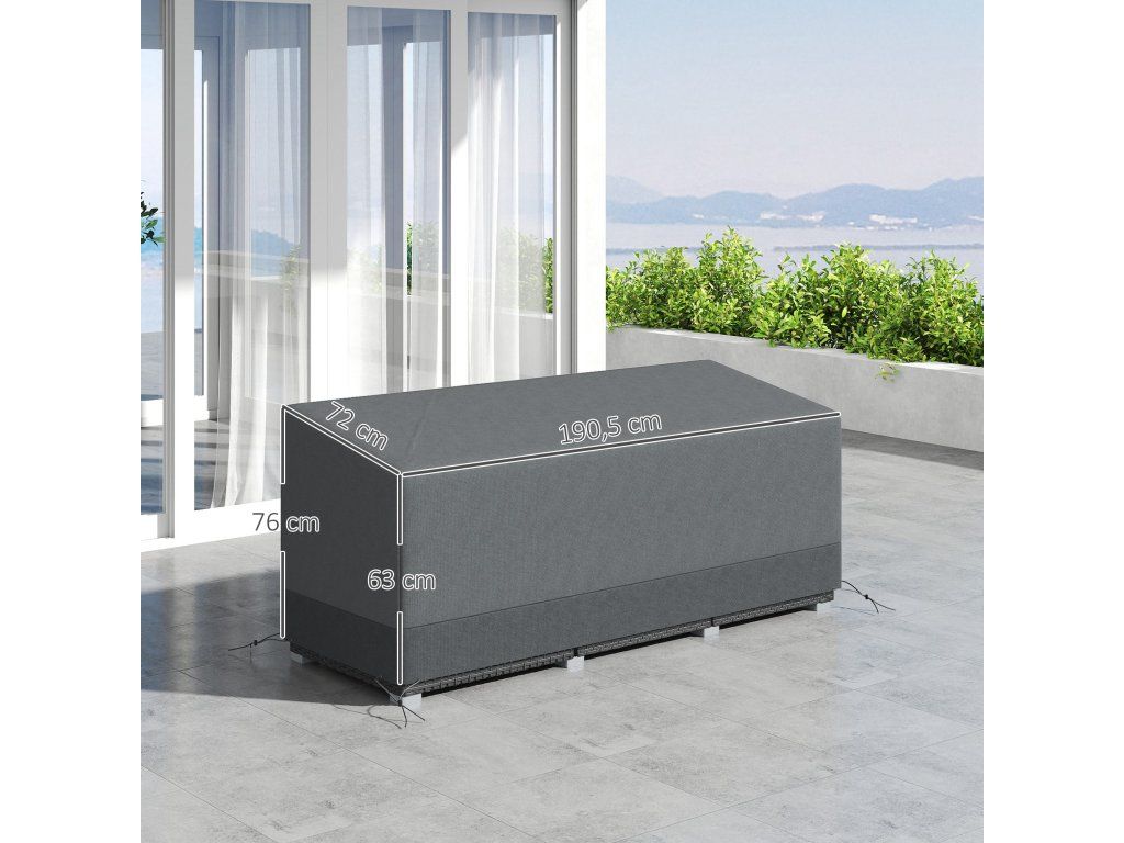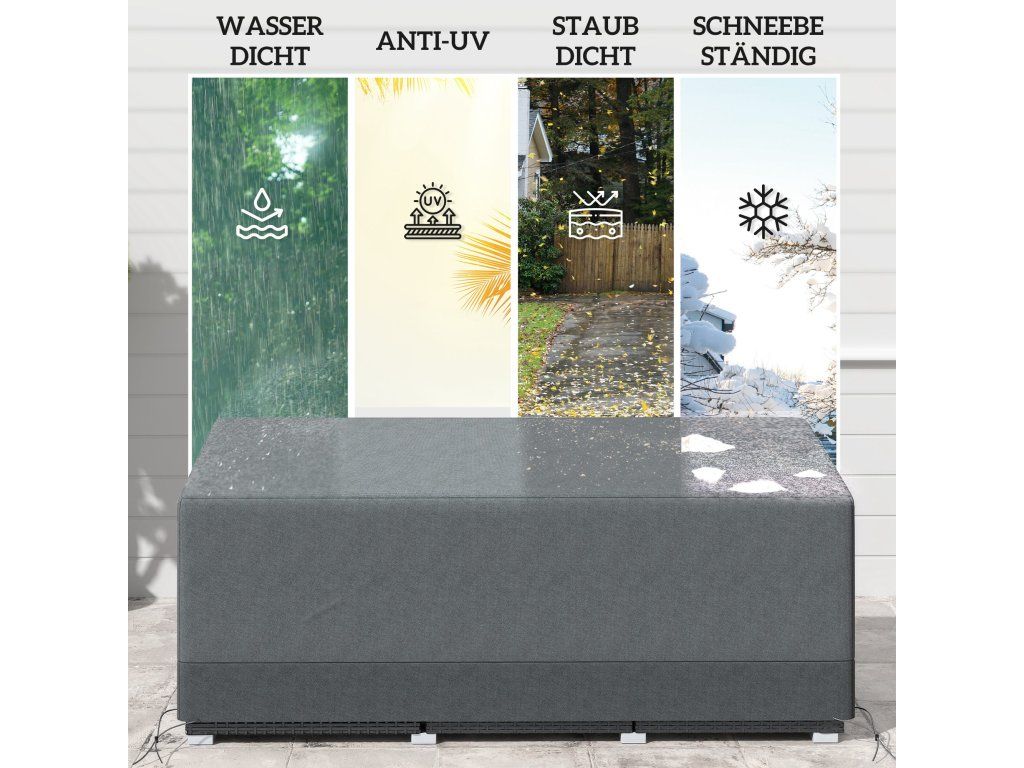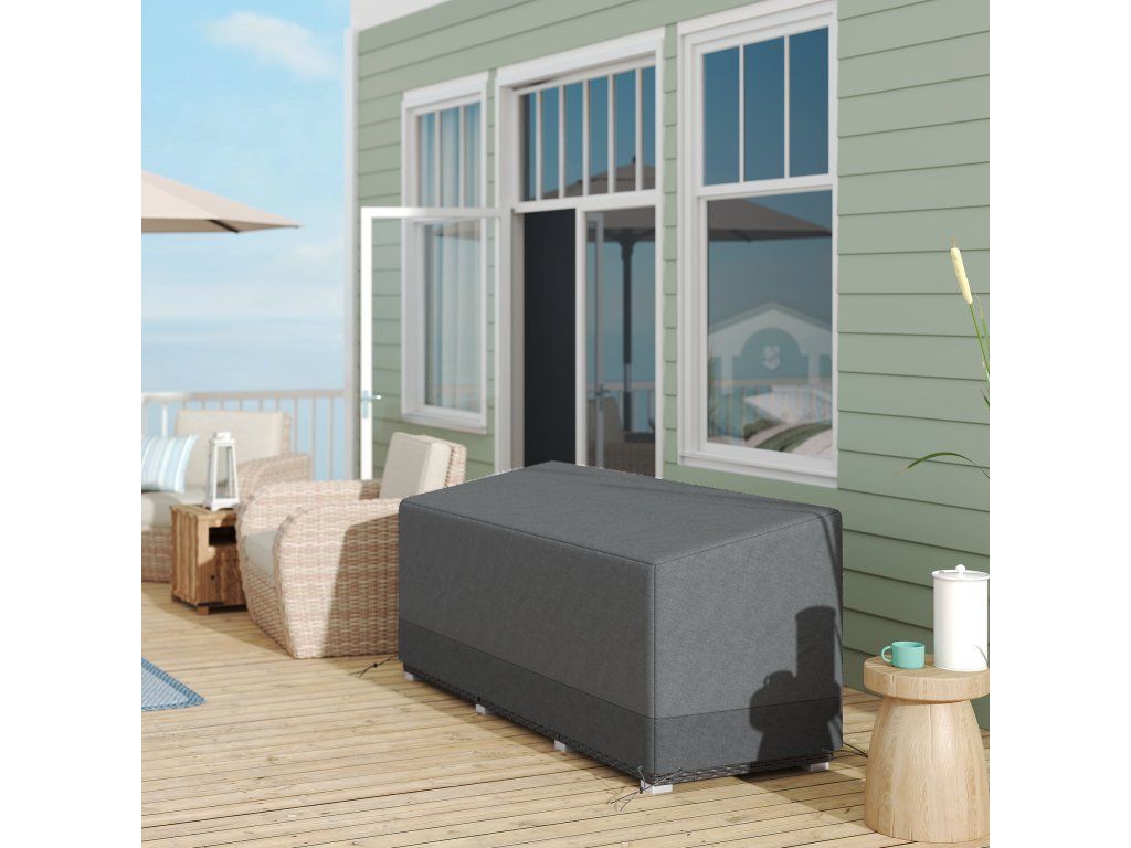 Chraňte svůj zahradní nábytek za každého počasí díky tomuto odolnému potahu. Vyroben je z vysoce husté oxfordské tkaniny 600D s PE zátěrem, který účinně chrání před vodou a UV zářením a zabraňuje tak poškození nábytku. Lehký design umožňuje snadné nasazení a sundání potahu bez námahy. Potah je navíc vybaven stahovacími šňůrkami pro pevné a bezpečné uchycení.