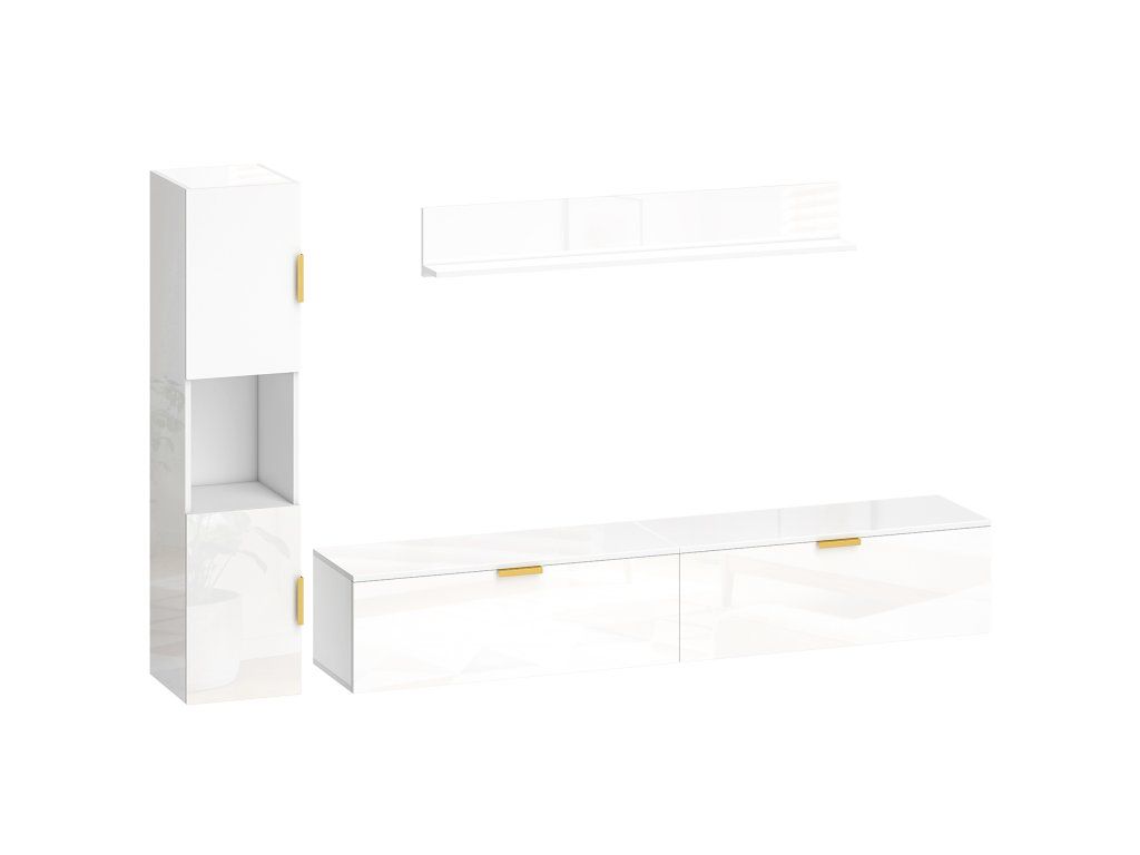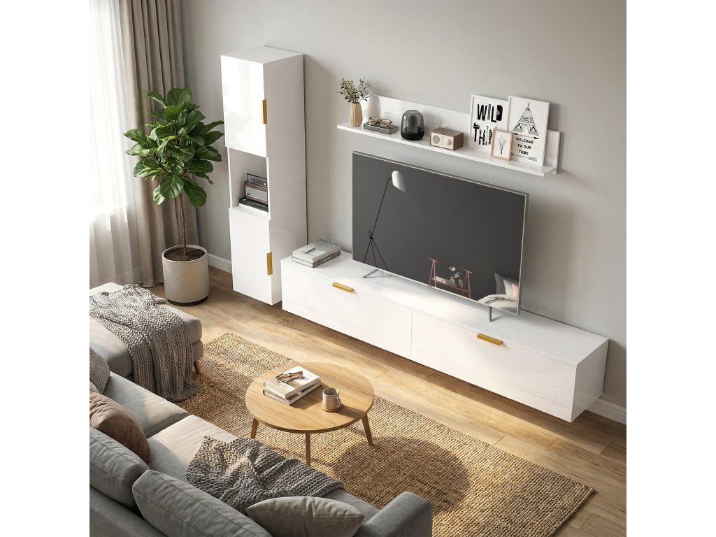 Kompletní nástěnné řešení: Třídílná sada TV skříněk s nízkou poličkou, boční skříňkou a policí. Plovoucí design vytváří prostor, zvětšuje místnosti a usnadňuje úklid.