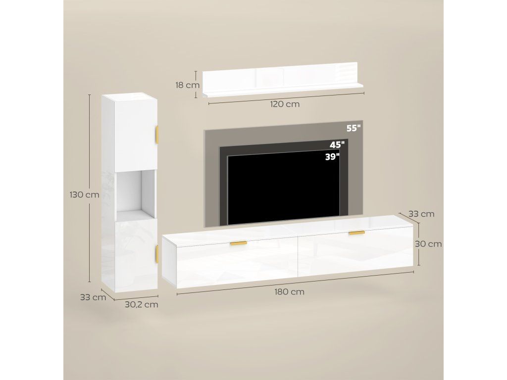✔ Celkové rozměry: 180 x 33 x 30 cm (TV stolek) 30,2 x 33 x 130 cm (boční skříňka) 120 x 12 x 18 cm (nástěnná police)