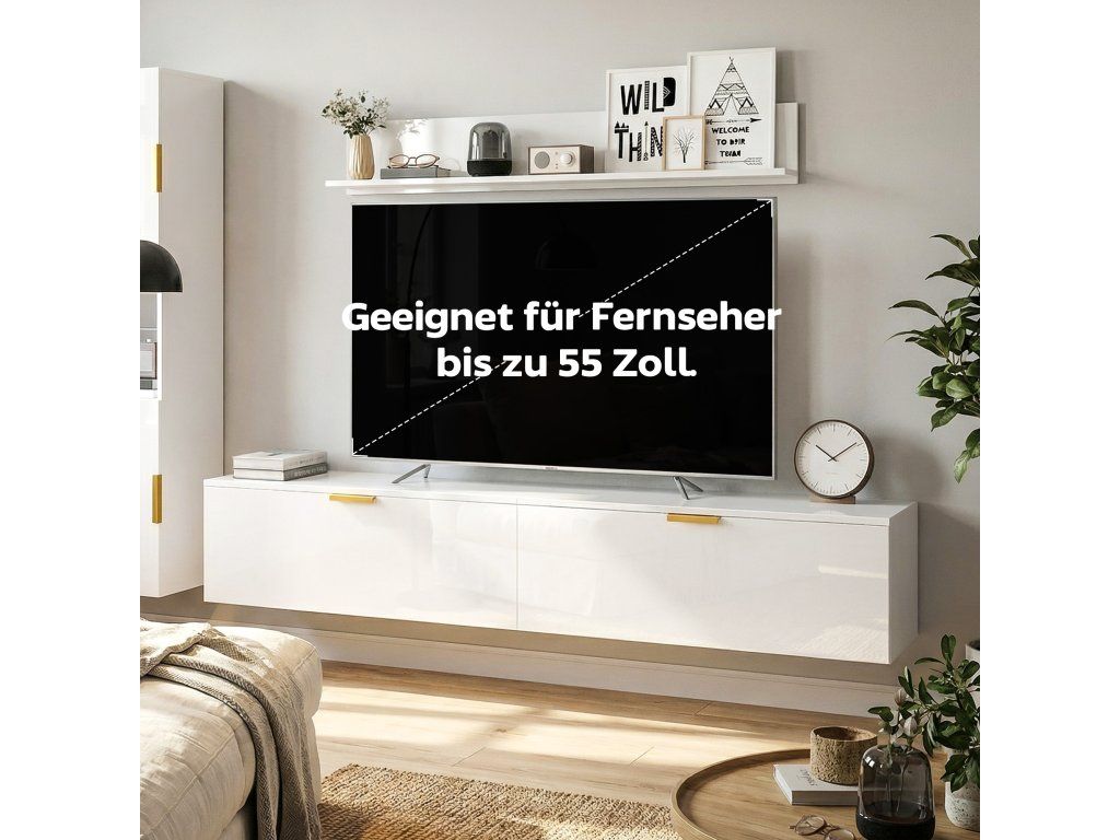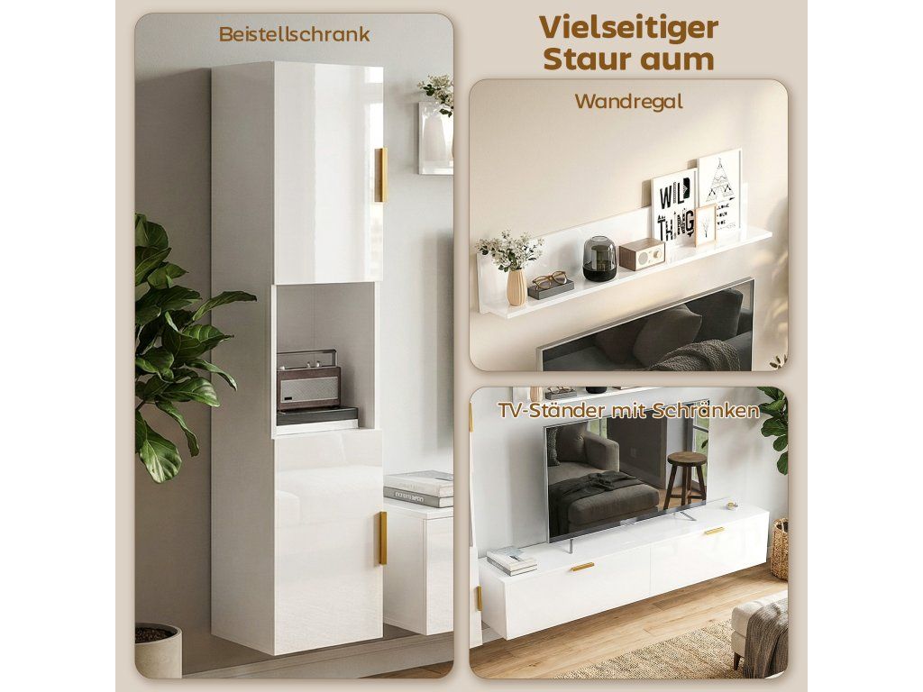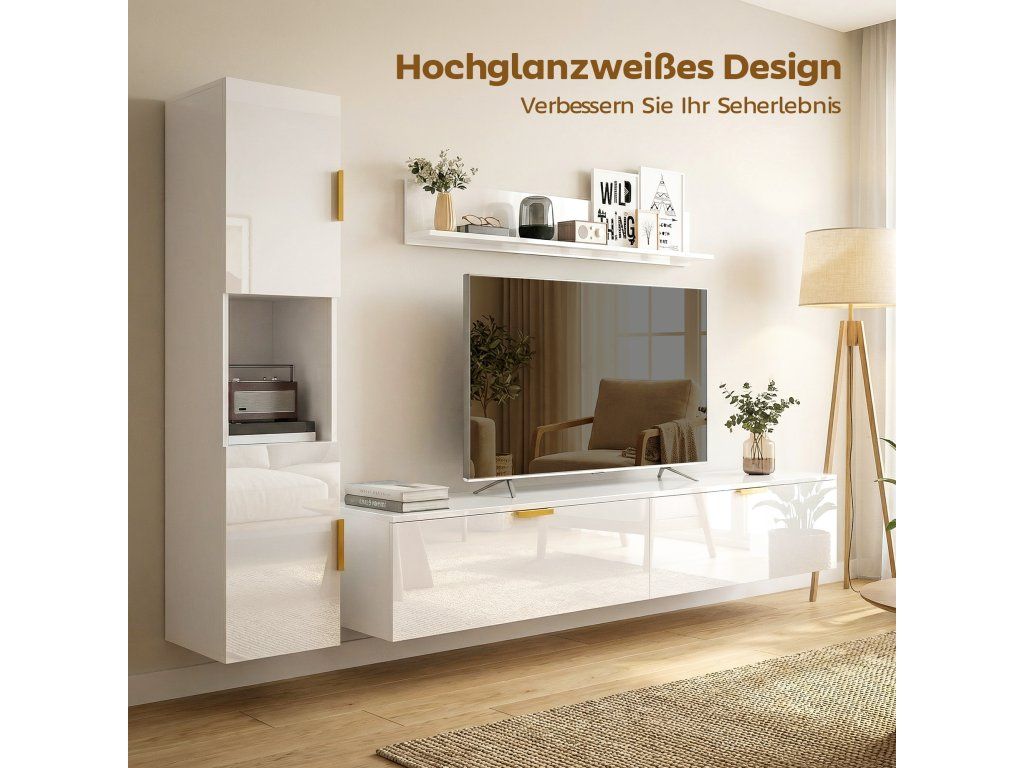 Minimalistický lesklý vzhled: Díky souvislé bílé lesklé povrchové úpravě a PVC fólii na všech viditelných plochách se tato moderní sada TV skříněk bez problémů začlení do jakéhokoli interiéru a dodá vašemu pokoji nádech stylové elegance.