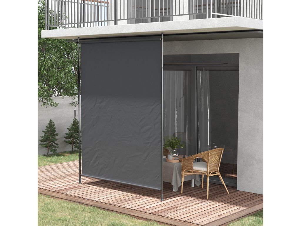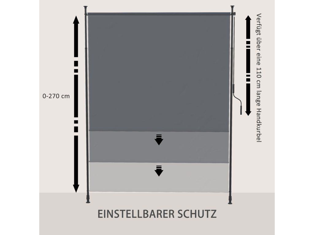 Chraňte svůj relaxační koutek před sluncem a UV zářením s touto markýzou na terasu. Vyrobena z robustního hliníku a pevného kovového rámu, je odolná a má dlouhou životnost pro venkovní použití. Markýza se ovládá ručně klikou a její délka je nastavitelná od 0 do 270 cm. Nastavitelné tyče lze připevnit téměř na jakýkoli povrch bez vrtání.