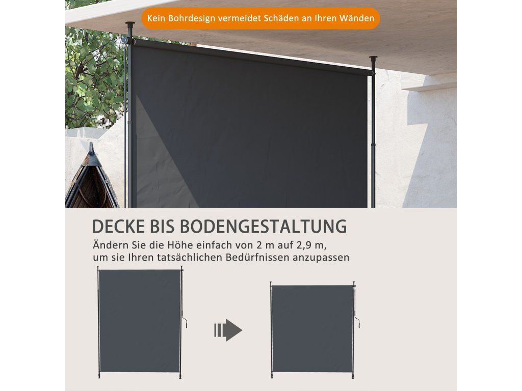 Provedení do výšky stropu: Díky nastavitelným upínacím tyčím můžete snadno nastavit výšku boční markýzy. Nastavitelná na 2,15 a 3,05 m. Pro instalaci není nutné vrtat, čímž se zabrání poškození stěn, a tato markýza je vhodná pro téměř jakýkoli povrch.