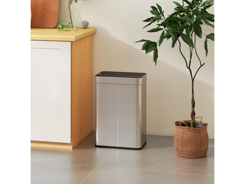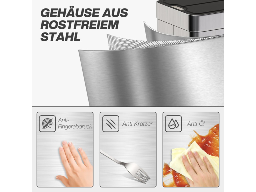 Povrchová úprava odolná proti otiskům prstů: Povrch z kartáčované nerezové oceli je odolný vůči otiskům prstů a šmouhám, takže koš ovládaný senzorem vypadá úhledně a čištění je snadné. Díky tomu je stylovým doplňkem každé kuchyně nebo kanceláře.